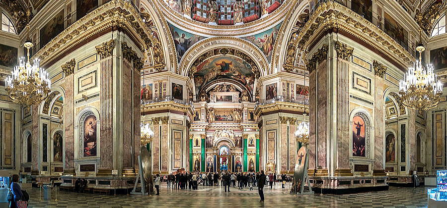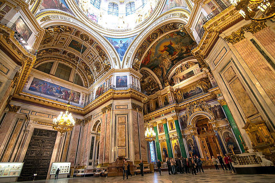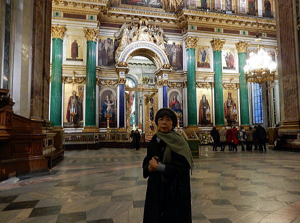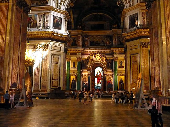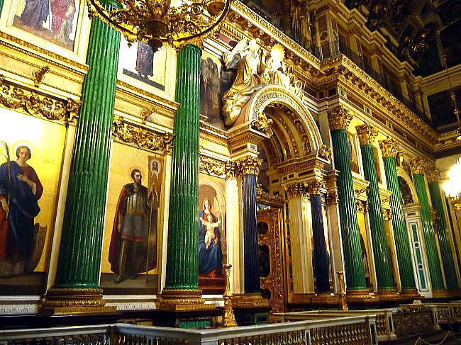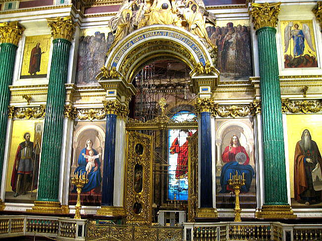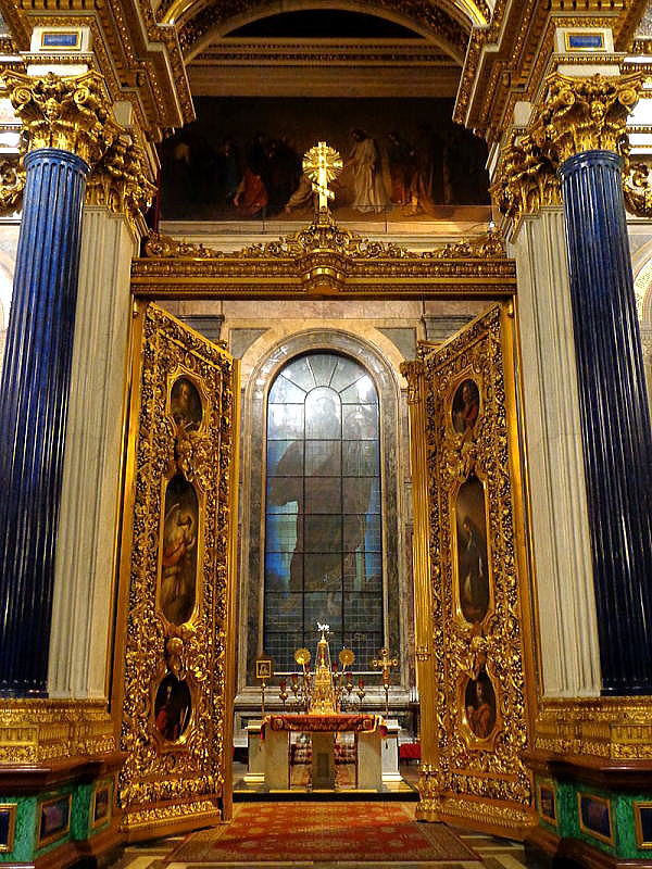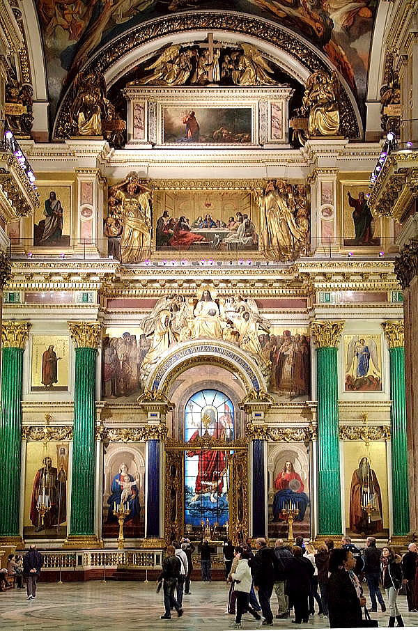 | ロシア短訪・総目次に戻る ・聖イサク大聖堂 概要 歴史 外装・外観 ドーム 建築設計 建築技術 内装 イコン 展望台 ◆サンクトペテルブルグ(Saint Petersburg) サンクトペテルブルク歴史地区と関連建造物群 ![]() ◆聖イサアク寺院の内装 聖イサアク寺院の内部に入るには、拝観料が必要です。拝観料は250ルーブル、約500円です。私たちは夕暮れに聖イサアク寺院の内部に入りましたが、外観の荘厳さ、重厚さとは別に、内部の色鮮やかな、壁面、天井一帯に配置されたイコンとは、まさに驚嘆のひとことです。 筆舌に尽くせぬとはこのことで、ロシア正教会の中核的寺院、それもサンクトペテルブルグの中心に位置するこの寺院の素晴らしさに圧倒されました。 内部概要 聖イサク大聖堂の重厚な彫刻によって覆われた戸は、フィレンツェのバティステロ・ディ・サン・ジョヴァンニ:Battistero di San Giovanni (Florence)の手によるものです。 壁柱や床、彫像は様々な色彩の花崗岩や大理石によってできています。 内装詳細 イヴァン・ヴィタリの浅浮き彫で覆われた大聖堂の青銅の扉は、ロレンツォ・ギベルテがデザインしたフィレンツェのサン・ジョヴァンニ洗礼堂の有名な扉(天国への門)がありますが、それに倣って模様が描かれたものです。 ![]() イヴァン・ヴィタリの浅浮き彫で覆われた大聖堂の青銅の扉 天国への門 Source:Wikimedia Commons Di Deror avi - Opera propria, CC BY-SA 3.0, Collegamento ドームのてっぺんからつるされた白い鳩の彫刻は、聖霊を現しています。内部の大小の柱や床、モンフェランの彫像など内装は、ロシアの各地から集められた多彩な花崗岩と大理石で造られていることが特徴となっています。 イコノスタシス(聖障)は、8本の半貴石からできている柱で縁取られており、マラカイト製が6本、ラズライト(青金石)製が2本となっています。 4つのペディメント(柱の上部の水平部分と斜めの2面の屋根に囲まれた3角形の切妻)にもたっぷりと彫刻が施されています(これは外観、外装の頁に写真があります)。 インテリアは当初からカール・ブリュロフ(Karl Bryullov)や他の偉大なロシアの巨匠たちによる数々の絵画で装飾されていました。 これらの絵画が寒さや大聖堂内部の過酷な環境によって次第に傷み始めると、モンフェランはミハイル・ロモノソフによってロシアで導入された技術であるモザイクで丹念に再現するように命じました。 ![]() Saint Isaac's Cathedral Iconostase of Saint Isaac's Cathedral Source:Wikimedia Commons By Deror avi - Own work, CC BY-SA 3.0, Link 聖イサアク大聖堂の内装とイコンの数々 撮影青山貞一 Nikon Coolpix S9900 2017-2 ![]() Iconostase of Saint Isaac's Cathedral Source:Wikimedia Commons By GraceKelly - Own work, CC BY-SA 3.0, Link ![]() 聖イサアク大聖堂内の天井 撮影青山貞一 Nikon Coolpix S9900 2017-2 ![]() Iconostase of Saint Isaac's Cathedral Source:Wikimedia Commons By Андрей Колычев, CC BY 3.0, Link ![]() Iconostase of Saint Isaac's Cathedral Source:Wikimedia Commons By Ximeg - Own work, CC BY-SA 3.0, Link |
