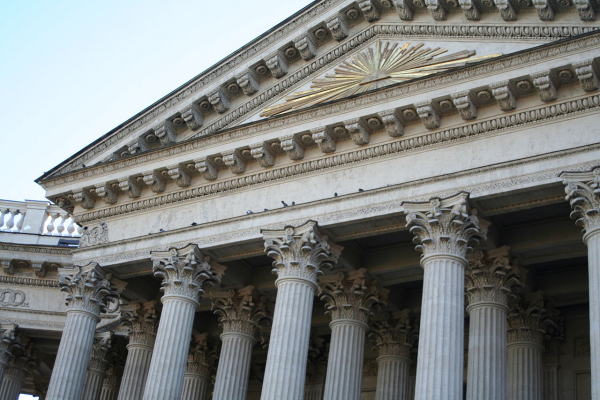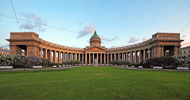 | ロシア短訪・総目次に戻る ・カザン聖堂 概要・歴史 建築 内装 イコン ◆サンクトペテルブルグ(Saint Petersburg) サンクトペテルブルク歴史地区と関連建造物群 ![]() ◆カザン聖堂の建築 カザン聖堂の概観上の特色は、ネフスキー大通りに面して半円状に弧を描くコリント式列柱の回廊です。 聖堂はラテン十字形のプランであり、当初予定案では、南側にも列柱による半弧回廊が建設されるはずでした。 ドームの建設に当たりヴォロニーヒンは、採光用の天窓を設置し外側ドームの天井画が自然光によって浮き上がるように演出しました。 下の図は、カザン聖堂の平面図(英語ではプランと言います)です。 時期的に見て、聖イサク大聖堂の建築で巨大な円錐脊柱を鉛直に立てる技術を習得していたとはいえ、これだけ多くの脊柱を建てるのは並大抵な者ではないはずです。 また平面図を見ると、カザン聖堂のファザードは、イタリア、バチカン公国のサン・ピエトロ大聖堂にさらに似ていることが分かります。正面から見るとサン・ピエトロ大聖堂的ファザードしか見えませんが、平面図を見ると、それよりかなり後ろ側にドームの中心があり、上下はシンメトリーですが、左右はまったく異なっていることが分かります。 ![]() カザン聖堂の設計図案 Source:Gravity Falls 下はイタリアのバチカン公国にあるサンピエトロ大聖堂のファザード以外の平面図と側面図です。 すなわち、サン・ピエトロ大聖堂の構造図の左側に続く広場は省略されています。左側が正面(隣の写真参照)であり、真東を向いている。平面図にある建物は南北約150m、東西約210mあります。 カザン聖堂の平面図の左右をひっくり返すと、サンピエトロ大聖堂の平面図に重なります。 ![]() サン・ピエトロ大聖堂の構造 図の左側に続く広場は省略されている。左側が正面(隣の写真参照)であり、真東を向いている。平面図にある建物は南北約150m、東西約210m 出典:Source:Wikimedia Commons Dominio público, Enlace 以下は背後から見たカザン聖堂の写真です。 ![]() サンクトペテルブルグの背後からのカザン聖堂の眺め Source:Wikimedia Commons さらに下は南西側から見たカザン聖堂の写真です。 ![]() カザン聖堂の背後からの長め Source:Wikimedia Commons 以下は正面から見たカザン聖堂のファザードです。まるでサンピエトロ広場に似ています。 カザン聖堂(カザン大聖堂、カザン寺院) Source:Wikipedia以下はカザン聖堂の斜め上からのパノラマビューです。サンクトペテルブルクの市内が見えます。 ![]() サンクトペテルブルグのカザン聖堂のパノラマビュー Source:Wikimedia Commons 下は、ファザードの円錐脊柱群です。まるで、ギリシャやローマ帝国時代の遺跡のようです。 ![]() カザン聖堂(カザン大聖堂、カザン寺院) Source:Wikimedia Commons ![]() カザン聖堂(カザン大聖堂、カザン寺院) の円柱群 Source:Wikimedia Commons つづく |