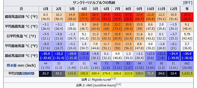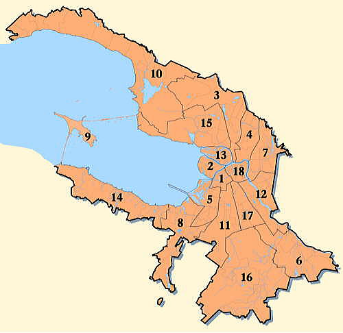 気候 ケッペンの気候区分では亜寒帯の湿潤大陸性気候 (Dfb) に属します。5月半ばから7月半ばの2ヶ月間は昼が長く、日の入り後、日の出前も薄明の時間が長いです。 その一方、冬の日照時間は非常に短くなります。冬の寒さは暖流の影響で内陸部やモスクワよりは温和ですが、時に-25度前後の日々が一週間程度続くことも珍しくありません。 年間降雪量は297cmほどと欧州の都市のなかでは多い方です。高緯度なため、日照時間が増えてくる2月が最寒月となります。過去最低気温は1883年のマイナス35.9度、過去最高気温は2010年8月の37.1度です。 ![]() 出典:Wikipedia 行政 行政区分 下の図は、サンクトペテルブルグ市の行政区分を表しています。 ![]() 出典:Souce:Wikimedia Commons Автор: Panther - собственная работа, CC BY-SA 3.0, Ссылка サンクト・ペテルブルクには、以下の19の行政区が設置されています。 1.アドミラルチェイスキー区(Admiralteysky) 2.ワーシリエオストロフスキー区(Vasileostrovsky) 3.ヴィボルグスキー区(Vyborgsky) 4.カリーニンスキー区(Kalininsky) 5.キーロフスキー区(Kirovsky) 6.コルピンスキー区(Kolpinsky) 7.クラスノグヴァールジェイスキー区(Krasnogvardeysky) 8.クラスノセルスキー区(Krasnoselsky) 9.クロンシュタットスキー区(Kronshtadtsky) 10.「クロンシュタット」を参照 11.クロートヌィ区(Kurortny) 12.モスコフスキー区(Moskovsky) 13.ネフスキー区(Nevsky) 14.ペトログラードスキー区(Petrogradsky) 15.ペトロドヴォレツォヴヌイ区(Petrodvortsovy) 16.プリモルスキー区(沿海区)(Primorsky) 17.プーシキンスキー区(Pushkinsky) 18.フルンゼンスキー区(Frunzensky) 19.ツェントラーリヌイ区(中央区)(Tsentralny) 経済 サンクトペテルブルクはロシアを代表する港湾工業都市です。造船業を初めとして、電気機器、工作機械・工具類、農業機械、化学工業、製紙、家具、繊維・衣類、食品加工、タバコ、皮革などの工業が発達しています。 ![]() 旧サンクトペテルブルク証券取引所。現在は中央海軍博物館 Source:Wikimedia Commons Sergey Nemanov, CC 表示-継承 2.5, リンクによる つづく |