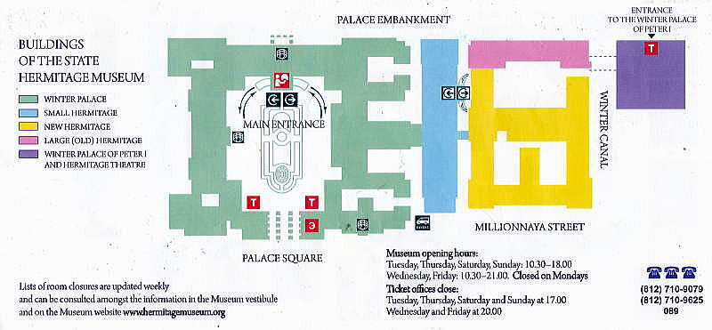 ロシア短訪・総目次に戻る ・エルミタージュ全フロアー紹介 構成・フロアー案内 1階フロアー 2階フロアー 3階フロアー ◆サンクトペテルブルグ(Saint Petersburg) サンクトペテルブルク歴史地区と関連建造物群 ![]() サンクトペテルブルグ市の紋章 サンクトペテルブルグ市旗 ![]() ◆エルミタージュ美術館の構成 エルミタージュには、下図のように王宮広場がら見て左から右へ「5つの美術館」があります。 ①エルミタージュ美術館(本館、冬の宮殿、通称、冬宮)、 Hermitage Museum ②小エルミタージュ、Small Hermitage ③大(旧)エルミタージュ、Great Hermitage ④新エルミタージュ、New Hermitage ⑤エルミタージュ劇場、 Hermitage Theater その他、 ⑥エルミタージュ美術館別館、Hermitage Museum Annex もあります。ただし、⑥エルミタージュ美術館別館については、詳細な別館紹介がありますので、ここでは割愛します。 ![]() 出典:入場時に至蛇ぢたパンフレットをもとに作成 ![]() 本出典:入場時にいただいたパンフレット ◆エルミタージュ博物館 各階フロアーの概要 次に上記の5つのエルミタージュ施設について、各階フロアーの概要を案内いたします。出典は入場時にいただいた英文パンフレットです。日本語はなく、大部分はロシア語ですが、何とか英語版のパンフをいただきました。 なお、次頁から1階、2階、3階の見どころ案内を順次いたします。 |