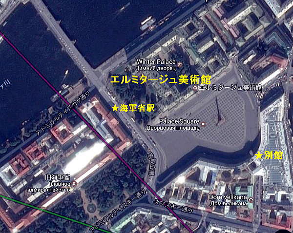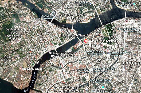 ロシア短訪・総目次に戻る はじめに 入館案内・諸活動 歴史概要 外観概要 内部概要 外装 歴史的外観 ◆サンクトペテルブルグ(Saint Petersburg) サンクトペテルブルク歴史地区と関連建造物群 ![]() サンクトペテルブルグ市紋章 サンクトペテルブルグ市旗 エルミタージュ美術館のロゴ ![]() 2017年2月のロシア現地視察の実質初日の午後、私たちはエルミタージュ美術館の本館(冬の宮殿、通称、冬宮)に行きました。 また夕方からは、宮殿広場を挟んで反対側にある参謀本部ビル(Rossi Wing)にあるエルミタージュ美術館の別館も視察しました。一方、エルミタージュ美術館が冬の宮殿であるのに対し、夏の宮殿、すなわちエカテリーナ宮殿は翌日午前に視察しています。エカテリーナ宮殿はエルミタージュ美術館より南東約40kmにあります。 ◆エルミタージュ美術館 Hermitage Museum エルミタージュ美術館(Hermitage Museum)は、サンクトペテルブルクにあるロシアの国立美術館であり同時に世界有数の美術館です。 エルミタージュ美術館はロシアのというよりまさに世界的な美術館であり、1990年に世界遺産(サンクトペテルブルク歴史地区と関連建造物群)に包括登録されています。 ロシア語の正式名称はГосударственный Эрмитаж(国立エルミタージュ)。「エルミタージュ」とはフランス語でHermitage、(隠遁者/世捨て人の部屋)という意味です。 エルミタージュ美術館は、小エルミタージュ、新エルミタージュ、エルミタージュ劇場、冬宮殿と5つの建物が一体となって構成されており、現在本館となっている冬宮殿はロマノフ朝時代の王宮、宮殿です。またそれとは別に、西洋絵画の新たな展示場所を確保するため、宮殿広場をはさみエルミタージュ美術館の向かい側にある建物の一角に別館もあります。 以下はネヴァ川から見たエルミタージュ美術館の美しい建物群です。 ![]() サンクトペテルブルク、冬の宮殿 ネヴァ川から見たエルミタージュ美術館の建物 Sankt-Petorburg, Zimni palac Source:Wikimedia Commons ◆エルミタージュ美術館への場所と行き方 エルミタージュ美術館は、下の地図にあるようにサンクトペテルブルグ市街地の中心にあり、いずれもネヴァ河に面して並んでいます。 ![]() 出典:グーグルマップ このエルミタージュ美術館への行き方ですが、地下鉄の場合、最寄駅は地下鉄5号線の海軍駅( Адмиралтейская)下車が至近です。その他にも多数地下鉄駅はありますが、地下鉄5号線の海軍駅が本館に近く便利です。 ![]() 出典:グーグルマップ 下は衛星画像でみたエルミタージュ美術館です。 以下をの地図で分かるように、エルミタージュ美術館には海軍駅以外に、たくさんの地下鉄駅があることが分かります。地図に電車のマークがついている場所が地下鉄の駅です。 またエルミタージュ美術館の周辺にはネヴァ河だけでなく多数の運河があります。そんなことからこの辺りは、ロシアのヴェネッチアと呼ばれています。 ![]() 衛星画像でみたエルミタージュ美術館 出典:グーグルアースグルマップによるエルミタージュ美術館 以下はエルミタージュ美術館周辺の名所旧跡、ランドマークなどです。エルミタージュ美術館の周辺には、ロシア正教会の総本山、聖イサク大聖堂、カザン大聖堂、血の上の救世主教会など、サンクトペテルブルグを代表するロシア正教の大聖堂や寺院がたくさん並んでいます。 ![]() 現在のサンクトペテルブルグ中心部 出典:ワールド航空サ-ビス つづく |