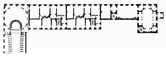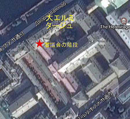 | ロシア短訪・総目次に戻る ・エルミタージュの階段 ヨルダンの階段(本館、冬宮) 評議会の階段(大エルミタージュ) 新エルミタージュの階段他 大教会の階段 ◆サンクトペテルブルグ(Saint Petersburg) サンクトペテルブルク歴史地区と関連建造物群 ![]() ◆その他の階段(1) 大エルミタージュの「評議会の階段」 エルミタージュでは、冬宮(現在博物館)にある「ヨルダンの階段」が有名ですが、大(旧)エルミタージュと新エルミタージにも素晴らしい階段があります。 ![]() 出典:入館時英文パンフより作成 以下は大エルミタージュにおける「審議会の階段」のおおまかな位置です。 ![]() 大エルミタージュの審議会の階段の位置 Source:グーグルマップストリートビュー 大エルミタージュの階段は、Council Staircase、評議の階段と呼ばれています。以下の平面図は、その大エルミタージュに階段が左端に含まれたものです。これは1777年時点での計画案です。 ![]() Georg Friedrich Veldten. Design of the Great Hermitage's first floor plan. 1777 Par Юрий Фельтен (нем. Georg Friedrich Veldten; 1730—1801) — В. М. Глинка, Ю. М. Денисов, М. В. Иогансен и др.; Под общ. ред. Б. Б. Пиотровского / Эрмитаж. История строительства и архитектура зданий — Л.: Стройиздат, Ленинградское отделение, 1989. — 560 с., Domaine public, Lien Source:Wikimedia Commons ただし、上の平面図(PLAN)は実際に出来た大エルミタージュとは異なり、上下が180度ひっくり返っています。 ![]() Reference: Georg Friedrich Veldten. Design of the Great Hermitage's first floor plan. 1777 さらに、以下の平面図は、現状と比べると向きが90度異なります。 そこで、最終案に近いものに修正してみました。以下は最終案に近い審議会の階段の計画図です。これらはあくまでも青山が想像して修正した試案です。 ![]() Reference: Georg Friedrich Veldten. Design of the Great Hermitage's first floor plan. 1777 大エルミタージュの会談は、「評議会の階段」(Council Staircase)とよばれています。 この「評議会階段」(Council Staircase)は、1850年代に建築家Andrei Stakenschneiderによってつくられました。そしてロシア帝国の時代の 19世紀に、国務院が1階のホールで会合し使っていたことから、「評議会の階段」という名前がつけられ現在に至っています。 階段の2階フロアには、大きなマラカイト[緑色]の大きな花瓶が置かれています。 この「評議会の階段」は3つの建物 -すなわち 小エルミタージュ、大エルミタージュおよび新エルミタージュを結んでいます。 ![]() Russia 2698 (4118854470) 「評議会の階段」(Council Staircase) ![]() 「評議会の階段」(Council Staircase) Source:グーグルマップストリートビュー ![]() The Council Staircase of the Hermitage Museum Source:Wikimedia Commons By se. en ful - originally posted to Flickr as 2008 - Mars - St. Petersburg, CC BY 2.0, Link 「評議会の階段」(Council Staircase) 以下はマラカイト[緑色]の大きな花瓶です。この「ロシアのモザイク技術」にあるマラカイト[緑色]の花瓶は、1850年代、エカテリンブルク奨学金で作成された作品です。マラカイは日本語でクジャク石を意味します。 ![]() Source:グーグルマップストリートビュー Russia 2698 (4118854470) 下は「審議会の階段」の天井絵です。 ![]() This photo of State Hermitage Museum and Winter Palace is courtesy of TripAdvisor “A state staircase (later called the Council Staircase) - The ceiling” つづく |