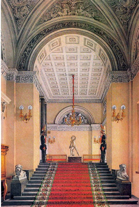 | ロシア短訪・総目次に戻る ・エルミタージュの階段 ヨルダンの階段(本館、冬宮) 評議会の階段(大エルミタージュ) 新エルミタージュの階段他 大教会の階段 ◆サンクトペテルブルグ(Saint Petersburg) サンクトペテルブルク歴史地区と関連建造物群 ![]() サンクトペテルブルグ市の紋章 サンクトペテルブルグ市旗 エルミタージュには、「ヨルダン階段」、「評議会の階段」などとは別に、以下のように大教会やパビリオンホール、劇場などにも素晴らしい階段が多数あります。 ◆その他の階段 大教会、10月の階段、大理石の階段 以下は、冬宮殿の大教会(Grand Church)の階段です。 ![]() Interiors of the Winter Palace. The Church Staircase 冬宮殿の内装、教会の階段 Source:Wikimedia Commons Eduard Hau - http://www.arthermitage.org/Edward-Petrovich-Hau/Interiors-of-the-Winter-Palace-The-Church-Staircase.html, パブリック・ドメイン, リンクによる 以下は、エルミタージュ、冬宮殿にある階段です。 ![]() Interior of the Hermitage エルミタージュの内装 Source:Wikimedia Commons By Chatsam - Own work, CC BY-SA 3.0, Link 以下はエルミタージュ、冬宮殿の「10月の階段」です。この「10月の階段は1917年のソビエト革命で有名です。 ![]() Interiors of the Winter Palace. His Majesty Own staircase (now October Staircase) Source:Wikimedia Commons By Konstantin Ukhtomsky - A.Н. Воронихина Виды залов Эрмитажа и Зимнего Дворца в акварелях середины 20-го века Москва Искусство 1983, Public Domain, Link 以下はパビリオンホールの「大理石の階段」です。 ![]() A marble staircase in the Pavillion Hall of the Small Hermitage, St. Petersburg, Russia. ロシア、サンクトペテルブルグ、小エルミタージュのパビリオンホールの大理石の階段 Source:Wikimedia Commons By Brent Ozar - originally posted to Flickr as Hermitage, CC BY 2.0, Link 以下は「エルミタージュ劇場の階段」です。 ![]() Hermitage Theatre Stairs Source:Wikimedia Commons Tura8 - 投稿者自身による作品, CC 表示-継承 3.0, リンクによる つづく 新エルミタージュ施設紹介へ 総目次に戻る |