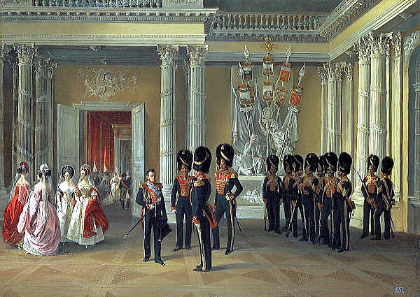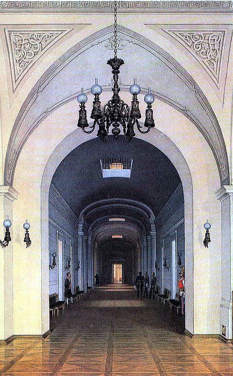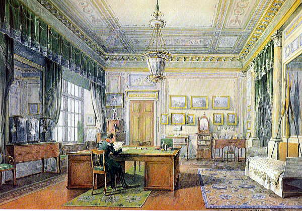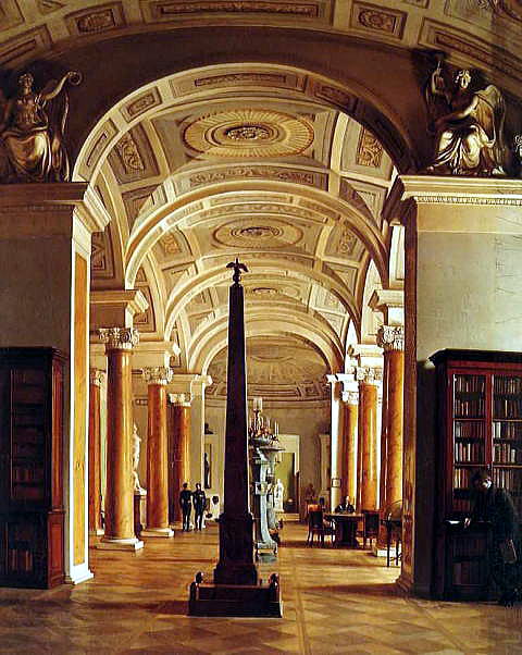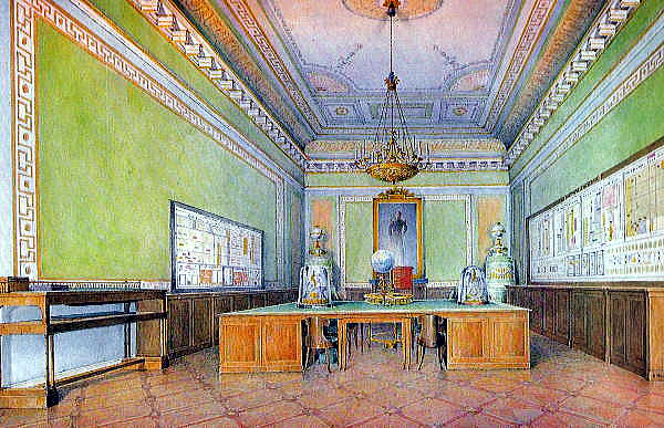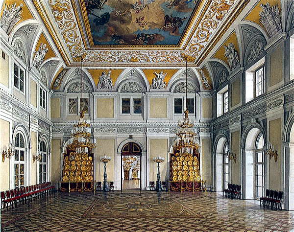 ロシア短訪・総目次に戻る ・本館(冬宮)施設・内装・備品 冬宮の秀逸インテリア1 冬宮の秀逸インテリア2 冬宮の秀逸インテリア3 水彩画にみるエルミタージュ施設 ・パビリオンホールの内装・備品 パビリオンホール1 パビリオンホール2 パビリオンホールのクジャク時計 パビリオンホールの他の時計 軍事ギャラリー・軍人肖像 ◆サンクトペテルブルグ(Saint Petersburg) サンクトペテルブルク歴史地区と関連建造物群 ![]() ![]() ここでは、絵画に見るエルミタージュのインテリア、すなわち室内装色・備品について紹介します。室内には廊下、壁、天井、床など、調度にはシャンデリア、机、椅子なども含まれます。 ![]() アレクセイ・ティラノフ。エルミタージュ図書館の眺め。1827年、油絵。 エルミタージュ、サンクトペテルブルグ、ロシア。 Source:Wikimedia Commons Par Alexeï Tyranov — http://www.abcgallery.com/V/venetsianov/tyranov.html, Domaine public, Lien ![]() 冬宮の内部、暗い廊下 Source:Wikimedia Commons Konstantin Ukhtomsky - A.Н. Воронихина Виды залов Эрмитажа и Зимнего Дворца в акварелях середины 20-го века Москва Искусство 1983, パブリック・ドメイン, リンクによる ![]() 冬宮の内部、大(アラブ)ダイニングルーム Source:Wikimedia Commons Konstantin Ukhtomsky - A.Н. Воронихина Виды залов Эрмитажа и Зимнего Дворца в акварелях середины 20-го века Москва Искусство 1983, パブリック・ドメイン, リンクによる ![]() 冬の宮殿の紋章の広間。帽子。A. Ladyurner。1834 Source:Wikimedia Commons By А. Ладюрнер - http://i025.radikal.ru/1012/be/f1a80091db7d.jpg, Public Domain, Link Ге冬の宮殿の紋章の広間。帽子。A. Ladyurner。1834 Source:Wikimedia Commons Автор: А. Ладюрнер - http://i025.radikal.ru/1012/be/f1a80091db7d.jpg, Общественное достояние, Ссылка ![]() 冬の宮殿の控えの大広間 Source:Wikimedia Commons Автор: Ухтомский, Константин Андреевич - https://www.liveinternet.ru/users/belsika50/post336536579/, Общественное достояние, Ссылка ![]() 冬の宮殿の内部、書斎/寝室 Source:Wikimedia Commons グリゴリー・チェルネツォフ - A.Н. Воронихина Виды залов Эрмитажа и Зимнего Дворца в акварелях середины 20-го века Москва Искусство 1983, パブリック・ドメイン, リンクによる 冬の宮殿の内部、学習室(ロシア語表記:Учебная комната)Source:Wikimedia Commons グリゴリー・チェルネツォフ - A.Н. Воронихина Виды залов Эрмитажа и Зимнего Дворца в акварелях середины 20-го века Москва Искусство 1983, パブリック・ドメイン, リンクによる つづく |