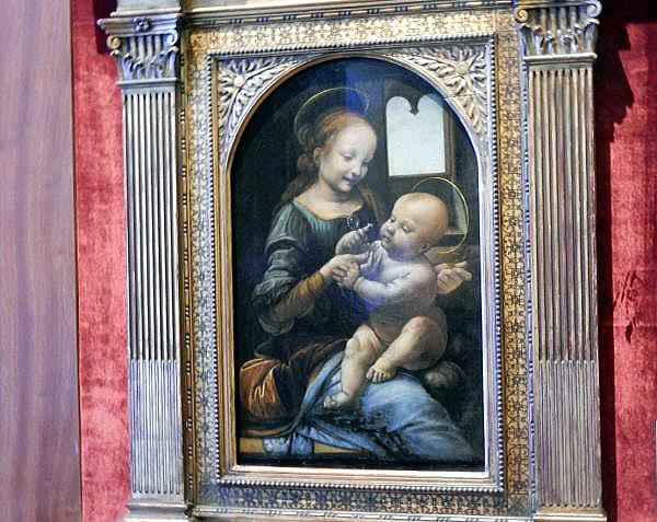 ・「リッタの聖母」 『リッタの聖母』(伊: Madonna Litta)は、1490年から1491年にルネサンス期のイタリア人芸術家レオナルド・ダ・ヴィンチが描いたといわれる絵画です。19世紀にミラノ貴族のリッタ家が所有していたことから『リッタの聖母』と呼ばれており、現在はサンクトペテルブルクのエルミタージュ美術館が所蔵しています。 「授乳の聖母 (en:Madonna lactans)」と呼ばれる、幼児キリストに母乳を与える聖母マリアを描いた作品です。レオナルドのキャリア初期の作品である『カーネーションの聖母』とよく似たアーチ状の二つの窓がある薄暗い背景に人物像が配されており、窓外には空気遠近法を使用した山並みの風景が描かれています。幼児キリストが左手に握っているゴールドフィンチは、キリストの受難の象徴となっています。 『リッタの聖母』の作者については、研究者の間でも意見が分かれています。レオナルドの弟子であるジョヴァンニ・アントーニオ・ボルトラッフィオ (en:Giovanni Antonio Boltraffio) やマルコ・ドッジョーノ (en:Marco d'Oggione) の作だとする研究者もいますが、『リッタの聖母』を所蔵するエルミタージュ美術館はレオナルドの真作だとしています。 ![]() レオナルド・ダ・ヴィンチ 『リッタの聖母』 1490-1491年 Source:Wikimedia Commons レオナルド・ダ・ヴィンチ - Web Gallery of Art: 画像 Info about artwork, パブリック・ドメイン, リンクによる Leonardo da Vinci attributed - Madonna Litta ・「ブノアの聖母」 下の写真は、エルミタージュ美術館におけるレオナルド・ダ・ヴィンチ 「ブノアの聖母」 の実物展示を撮影したものです。絵画の実物は非常にちいさく、前に少しでも人がいるとほとんど見えないほどでした。 『ブノアの聖母』は、ルネサンス期のイタリア人芸術家レオナルド・ダ・ヴィンチが1478年に描いた絵画でし。1914年以来、サンクトペテルブルクのエルミタージュ美術館が所蔵しています。『花と聖母子』とも呼ばれ、レオナルドが1478年10月から制作を開始したと記録に残る二点の聖母子像の一つだと考えられています。