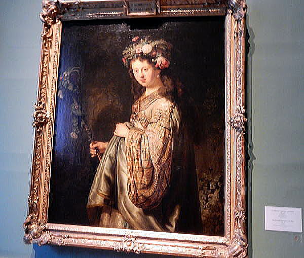 下の写真は、エルミタージュ美術館におけるレンブラント の「フローラに扮したサスキア」