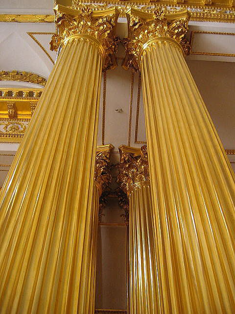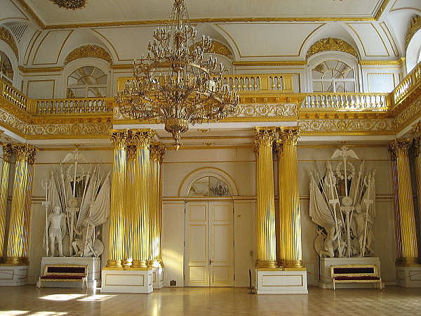 | ロシア短訪・総目次に戻る ・エルミタージュ冬宮(本館)の主要施設 ヨルダンの階段 大玉座の間 紋章の間 マーシャル将軍の間 軍事の間 大教会 アレクサンダーの間 白色の大広間 黄金の応接間 クジャク石の間 アラビアの間 ネヴァ河3広間 コラス1世円形の間 私的居住空間 庭園 コンサートホール ◆サンクトペテルブルグ(Saint Petersburg) サンクトペテルブルク歴史地区と関連建造物群 ![]() ![]() ◆紋章の広間 紋章の間は、エルミタージュ冬宮が小エルミタージュに突き出た部分(大ホール)の西側の赤い部分にあります。この勲章の広間は、大ホールに次いで大きく、広いホールとなっています。 ![]() 冬宮殿におおける紋章の間の位置 Source:Wikimedia Commons ![]() 紋章の間 Source:Wikimedlia Commons By Photo: Ivan Ozherelyev (Иван Ожерельев) ; Architect of work shown : VP Stasov - Found here ru:Изображение:Зал в классическом античном стиле в Зимнем Дворце.jpg on the Russian Wikipedia where it has GNU licence (29 March 2008). On 11 April 2008 a copy was uploaded to Commons and renamed to c:File:Amorial Hall.jpg. The original file was deleted from the Russian Wikipedia on 2 March 2013., CC BY-SA 3.0, Link 冬の宮殿の「紋章の広間」はもともと、公式な式典のために設計された大変広い部屋です。紋章の広間は、軍事展示室(ギャラリー)と宮殿の中庭の間に位置しています。 現在のホールは、1837年の宮殿の大火災によってオリジナルのホールが焼失したあと、1830年代末期にワシリー・スタソフが設計しました。その時に、溝を掘った柱の金メッキが施されました。 聖ジョルジュホールとニコラスホールとともに、紋章の広間は宮殿における主要な娯楽エリアとなっていました。 ホールの端には広大な石膏でつくられた鎧甲一式(武具)が飾られています。ホールの中心には1842年当時から、金なし地ガラス(アベンチュリン)製の宝石細工の花瓶が置かれています。 10月革命の後、アナトリー・ルナチャルスキー(ロシアの革命家でソ連初代教育人民委員(教育大臣))の指示のもと、紋章の広間(ホール)は収容人員は2000人までとし、コンサートホールとして使用されるようになりました。 ![]() 金の柱のクローズアップ Source:Wikimedlia Commons By Jennifer Boyer - originally posted to Flickr as gold pillars in Armorial Hall, CC BY 2.0, Link ![]() ドアのクローズアップ Source:Wikimedlia Commons By Jennifer Boyer - originally posted to Flickr as elaborate doors in Armorial Hall, CC BY 2.0, Link つづく |