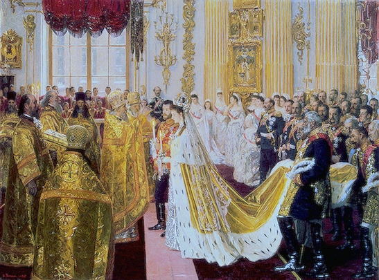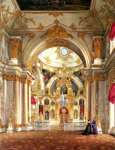 ロシア短訪・総目次に戻る ・エルミタージュ冬宮(本館)の主要施設 ヨルダンの階段 大玉座の間 紋章の間 マーシャル将軍の間 軍事の間 大教会 アレクサンダーの間 白色の大広間 黄金の応接間 クジャク石の間 アラビアの間 ネヴァ河3広間 コラス1世円形の間 私的居住空間 庭園 コンサートホール ◆サンクトペテルブルグ(Saint Petersburg) サンクトペテルブルク歴史地区と関連建造物群 ![]() ![]() ◆冬宮殿の大教会 大教会(グランド・チャーチ)は、冬宮の大ホールのすぐ南にある赤い部分の教会です。大教会という名称からもわかるように、エルミタージュ最大の荘厳で大きな教会です。 ![]() 冬宮殿における大教会の位置 Source:Wikimedia Commons ![]() 冬宮殿の救世主キリストのイコンの大聖堂、エデュアルド・ハル画(1866) 二つある教会のなかで一段と大きく重要な教会でした。サンクトペテルブルグにある冬宮殿内の大教会は、1763年に奉献され、時に、冬宮殿の大聖堂とも呼ばれます。 Source:Wikimedlia Commons サンクトペテルブルグにある冬宮殿内の大教会は、1763年に奉献され、時に、冬宮殿の大聖堂とも呼ばれます。 宮殿の大聖堂は、冬の宮殿の東翼の主要な部屋が集まっているメインフロア(1階)にあり、宮殿内に二つある教会のなかで一段と大きく重要な教会でした。 小さい方のより私的な教会は、1768年に建設され、建物の北東の一部の私的な居住エリアの近くにありました。大教会は、フランチェスコ・バルトロメオ・ラストレッリ(フランス生まれのイタリア人建築家。若くしてロシア帝国に移り、主としてロシアで活躍)が設計したもので、宮殿の中で、「最も素晴らしい部屋のひとつ」と評されています。 今日、教会は神聖な場所ではなく、国立エルミタージュ美術館の展示ホールとなっています。 ![]() 1894年11月14日/ 26日に宮殿の大教会で執り行われた、皇帝ニコラス2世とドイツのヘッセ・ダルムシュタットのアレクサンドル姫の結婚式を描いたLaurits Tuxenによる肖像画。 Source:Wikimedlia Commons ![]() サンクトペテルブルグ、冬宮殿の大教会 Source:Wikimedlia Commons Автор: Januarius-zick - собственная работа, CC BY-SA 4.0, Ссылка ![]() 大教会の天井ドーム Source:Wikimedlia Commons By GerardM at Dutch Wikipedia, CC BY-SA 3.0, Link つづく |