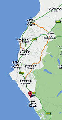 現地調査の実質最終日となる2012年7月25日、私達は宿泊先であるイングランド・カンブリア州カーライルから30kmほど南に下ったコッカーマスを出発し、A595を南西に向かった。下の地図は、コッカーマスからシースケール近くにあるセラフィールドまでの道順を示している。