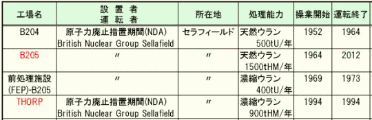 表 セラフィールド使用済核燃料再処理工場