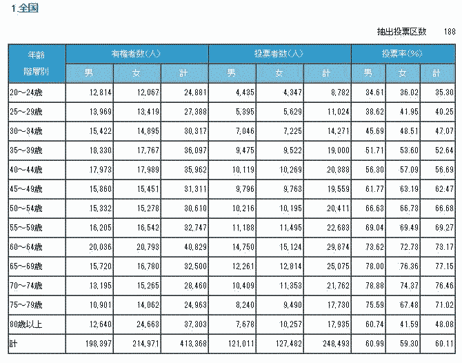 以下、青山のフェイスブックでの問題提起と意見です。少し拡充してあります。ただし、いわゆる青山の「友達」からの意見、反応は外しています。 ◆青山のフェイスブックでの問題提起1 下の表(新聞各紙の衆院選情勢報道)は、大メディアによる今回の衆議院議員選挙予想です。いずれも自民が300議席以上と予想しています。 確かに、今回は無党派層がしらけ、投票率が最悪となる可能性が高く、結果的に自民、公明、共産など、固定客をもつ政党が断然有利となる背景があります。 , 東京選挙区では、「野党1勝24敗」(後述)という前回さながらの専門家の予想もあります。いくらなんでも「野党1勝24敗」はないと思いますが。 しかし、自民党は秋口から何度も詳細な調査を専門コンサルタントなどに委託し独自に情勢分析をしてきましたが、おそらくその中で300議席超の予測があったからこそ、あえてこの時期に総選挙を行うのだと思います。 , 日本では政治不信が極限まで達していますが、それが選挙に行かない、投票しないこととなると、さまざまな既得権益をもつ政党、固定客をもつ政党が圧倒的に有利になります。 , 大メディアの選挙予想、過去を見るとかなりの確度であたっています。今のままだと悪夢の再来、デジャブとなりそうです! 大メディアの世論調査は、設問の設定、母集団の設定、調査方法などで問題ありと言えますが、ことこの種の選挙予想では、すぐに結果が出ることもあり、大メディアであっても恣意的は予測はしずらい面もあります。 ![]() 新聞各紙の衆院選情勢報道 出典:新聞各社の記事 ◆青山意見1 スマホ系の若者は選挙に行かず、世論調査の固定電話に対応するお年寄りはおしなべて選挙に行く、その結果がでています。累積債務、TPP、非正規雇用、原発、格差社会、集団適時経験、徴兵制などなど、いずれも本来、大部分が若者自分たちの問題となるはずなのにね! 8時間前 ・ いいね! ・ 1 ◆青山意見2 青山 貞一 これは高齢化社会のもうひとつの大きな問題点、側面ですね。しかも、圧倒的にお年寄りは若者、中年に比べ資産も持っている。株式投資などをしているのもお年寄りの方が多いんじゃないかな。自分たちの目先の利害で、持続可能社会がどんどん破壊され、格差社会がさらに接近している。にもかかわらず、投票しない、いかない若者は、まったく無関心、それが今の日本です。 7時間前 ・ いいね! ・ 4 ◆青山意見3 青山 貞一 リベラル派、リベラル層の大きな錯覚は、自分と同じようなことを考えている人々の中で、あれこれがんばっていることでしょう。問題は、すでにいろいろな課題が分かっている人たちではなく、分かっていない人たちにどう問題提起するか、コミュニケーションをとるかです。SNSやメール、MLで幾ら仲間うちでがんばっても、表は増えず、投票に行く人も増えません。 ◆青山のフェイスブックでの問題提起2 写真は衆議院議員選挙における年代別の投票率です(前回の46回衆議院議員選挙のデータです)。また平均投票率は約60%となっています。 これから明らかなことは、20〜24歳の年代が男女ともに顕著に低いことです。35%にすぎません。 次いで25〜29歳、さらに30〜35歳もかなり低くなっています。これは私が先に指摘したとおりです。若いそうではいずれも、女性より男性の方が低くなっています。 一方、60歳以上の高齢者は何と投票率が70%を超えています。65歳異常となると75%を超えています。これも先に指摘したとおりです。 40〜59歳は、平均程度なので、投票率を上げるうえで若者が政治を自分たち自身の問題ととらえ、最低限、投票に行くことが重要です。もちろん、ただ投票に行けばよいわけではありませんが、現状の35%はひどすぎます。 |