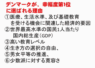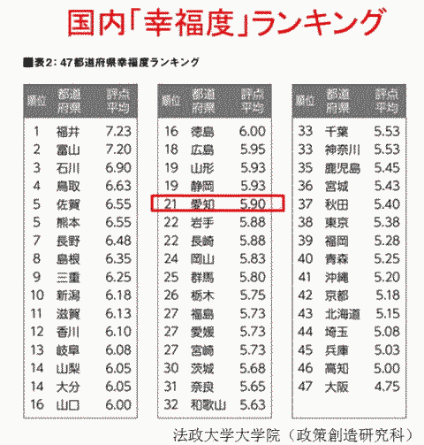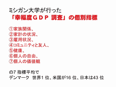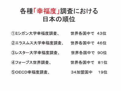 次は、「幸福度」についてです。 みなさんはご存じないでしょうが、正直でまじめに働く日本人は何と先進諸国で一番「幸福度」の低い国にランクされています。 ![]() ![]() 過去、そして現在行われている世界各国の大学などによる「幸福度」についての調査」で、日本は何と43位、36位、90位、81位、OECD諸国34カ国中19位。とてつもなく幸福度が低いのです。信じられないと思いますが事実です。 以下が幸福度調査を行った機関です。ミシガン大学は米国、エラスムス大学はオランダ、レスター大学は英国、フォーブスは米国の著名な雑誌社、そしてOECDは、経済協力開発機構といって先進国のお金持ち団体です。 ![]() 以下は、ランキングの内訳です。 ●ミシガン大学調査によるランキング 1位 デンマーク 2位 プエルトリコ 3位 コロンビア 4位 アイスランド 5位 北アイルランド 6位 アイルランド 7位 スイス 8位 オランダ 9位 カナダ 10位 オーストリア 16位 米国 43位 日本 ●エラスムス大学調査によるランキング 1. デンマーク(8.2) 2. スイス(8.1) 3. オーストリア(8.0) 4. アイスランド(7.8) 5. フィンランド(7.7) 6. オーストラリア(7.7) 7. スエーデン(7.7) 8. カナダ(7.6) 9. グアテマラ(7.6) 10. ルクセンブルク(7.6) 17. アメリカ(7.4) 22. 英国(7.1) 39. フランス(6.5) 44. 中国(6.3) 45. インド(6.3) 46. 日本(6.3) ●レスター大学調査によるランキング 1 デンマーク 2 スイス 3 オーストリア 4 アイスランド 5 バハマ .... 23 米国 41 英国 82 中国 90 日本 ●フォーブス調査によるランキング 1 デンマーク 2 フィンランド 3 ノルウエー 4 スエーデン 5 オランダ 6 コスタ・リカ 7 ニュージーランド 8 カナダ 9 イスラエル 10 オーストラリア 11 スイス 14 米国 15 オーストリア 17 英国 33 ドイツ 44 フランス 56 韓国 73 ロシア 81 日本 125 中国 ●OECD調査によるランキング 1 位 オーストラリア、 2 位 カナダ、 3 位 スウェーデン、 日本はOECD 加盟 34 ヶ国中19 位 さらに以下は、日本の都道府県における幸福度ランキングです。 法政大学の大学院が行った調査結果です。残念ながら愛知県はほぼ真ん中、21位となっています。 ![]() 幸福度を評価する具体的な指標をもとに日本人が不幸である原因を見てみましょう! ミシガン大学の調査では、家族、コミュニティ、住宅、健康などに大きな問題があることが分かりました。 事実、日本社会では過去20年で社会の格差が拡大しています。またコミュニティ(地域社会)が農村でも都市でも激しく破壊され、人々はばらばらに生活しています。 とりわけ、過疎のまちのお年寄りにとって、このことは深刻なものとなります。 ![]() 次に、OECD調査では、住宅、コミュニティ、環境、ガバナンス、生活満足度、ワークバランスなどが課題となっています。 ![]() 言うまでもなく、日本は海外諸国から「ウサギ小屋」と言われているように、狭い住宅となっています。しかも小さな住宅でも土地付きだと目が飛び出るほど高額です。 冒頭でお話ししましたが、日本の地方では過疎化、高齢化とともに核家族化が急激に進行しています。これは家族の崩壊、地域社会の崩壊と密接に関係します。 ガバナンスは行政の統治機構の問題です。日本では市町村のお役所が住民から離れ、まるで国や都道府県のようになっています。 ワークバランスは働き過ぎについての指標ですが、言うまでもなく日本人は働き過ぎです。ブラック企業論ではありませんが、これほどの労働時間をかけないと、普通の生活が出来ないとするなら、日本は先進国で一番貧乏な国となります。 下のスパイラルチャートによるOECDの幸福度指数調査では、日本が住居、生活と仕事、生活満足度、地域社会、ガバナンス、環境などで非常に低いスコアであることが分かります。とくに酷いのは生活と仕事、生活満足度、地域社会、政府と収入です。 生活と仕事、生活満足度、地域社会、政府はいずれも最下位となっています! 出典:OECD Better Life Index Ranking このように、日本人は正直で真面目に働きながら、けっして「幸福」ではないのです。 ![]() 下は、大部分の幸福度調査で第一位となっているデンマークの特徴を示したものです。 ![]() 何と、市野さんに聞けば、この第一位のデンマークに一年間留学で滞在し、研究されていたそうです。研究所での私の同僚、鷹取敦さん夫妻も北欧、とりわけデンマークに注目されています。 ![]() 1996年ユトランド半島北部で留学中に訪ねてきた友人 と一緒の市野和夫さん 見て分かるように、デンマークは福祉、教育、子育て、医療そして男女平等が進んだ国であることが分かります。 しかも、デンマーク国民の一人当たりの所得は、それほど高くはありません。逆に税金、年金、健康保険などの掛け金は高くなっています。 ![]() ![]() スイスのダボスで開催されている世界経済フォーラムWEF2012年では、毎年さまざまな分野でのランキングが発表さています。 日本は男女格差で世界で101位となっているのです。男女格差については、日本の現実はどうしようもないくらい酷