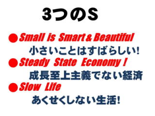 ではどうしたらよいでしょうか? ![]() 大切なことは、私たちの今まで当然と思ってきたこと、その発想、その価値観を根底から変えることが大切です! 発想を転換することにより、設楽町は巨大公共事業に依存することなく、町民の創意工夫によって、自然を生かした魅力あるまちづくりは可能です! ![]() 私は 3 S、すなわちSmall is Smart and Beautiful 、つまり、小さいいことはすばらしい!、Steady State Economy、つまり、成長至上主義でない経済、Slow life、つまりあくせくしない生活が人間の幸福にとって大切になると考えます。 まず、小さいことは、賢く、すばらしいのです。 まちは大きければ良いという従来の発想は間違っています。人間も自然の一部とすれば、今の大都市は、到底人が住むような場所ではありません。 次に、何度もお話ししましたが、日本はじめ先進諸国は、すでに十分、経済成長しています。成長の限界にあります。今後は、成長から成熟へ、量的な成長から質的な発展こそが大切となるのです。経済学で言う「定常状態の経済社会」です。 日本人は欧米人から笑われるように、あまりにも働き過ぎです。しかも、働いたことが報われない社会となっています。これからはあくせくしない、スローライフがもっとも大切な時代となるのです。 ![]() 3 Sをベースとして、設楽町には「小さくてもキラリと光るオンリーワンの地域づくり」が不可欠です。設楽町にあるさまざまな環境資源、たとえば森林資源、農業資源、生物資源、水資源などを生かすまちづくりが必要です。 また他の自治体にはない、設楽町ならではのまちづくりを町民みんなで進めます。すばらしい自然と共生する陶芸家のまち、木工細工家のまちなど、すでにはじまっている自然と共生する芸術家のまちもそのひとつでしょう。 設楽町でとれるさまざまな高原野菜やそれを生かした料理、それを食べさせるレストラン、さらに長期滞在型のリゾート・プチホテルやペンション、B&B(ベッド・アンド・ブレックファースト)もいいでしょう。 また自然、環境分野の研究者が600〜900mの標高の高台に、夏期滞在、長期滞在可能なまちづくり、ソフト開発企業のプログラマーが自然豊かな設楽のまちのリゾートオフィスで働けるまちづくりなど、自然、高地を生かした新たなまちづくりが考えられます。 ![]() 設楽町の90%が森林であることを生かした、すなわち自然力を生かしたまちづくりとして、自然エネルギーの活用があります。中小水力、ミニ水力、マイクロ水力など河川、水路を活用した水力発電、豊富なバイオマスを生かした発電、間伐材のチップ化による暖房など。すでに風力発電施設が立地されていますが、太陽光発電、太陽熱利用のコミュニティ銭湯などもいいと思います。 ひとつひとつは小さくても、それら地域に根ざす自然のエネルギーがまち全体のエネルギー自立を支えるようなまちづくりが求められています。 また設楽町には田峯観音・田峯城や南部には田舎歌舞伎の歴史、文化があります。 たとえば青山貞一が共同代表を務める政策学校一新塾の塾生であり女性映画監督でもある野田香里(かおり)さんは、群馬県の片田舎に残る歌舞伎に着目し、映画にするなどして、世界にそのまちの歴史文化を情報発信しています。 野田さんは、映画監督として日本文化、とりわけ伝統芸能、地方歌舞伎にこだわり続けます。ドキュメンタリー映画監督として、大歌舞伎で義太夫を語る竹本清太夫の至芸のドキュメント「歌舞伎、清太夫〜みなかみへ行く〜」を制作し、さらに地方歌舞伎の舞台裏方やその技法を映像を通じ、次世代に継承させたいという一心で、群馬県渋川市の旧渋川村に伝わる上三原田歌舞伎の舞台操作伝承のドキュメントに全力を注がれているのです。 ここでは、一年に一回、11月上旬に旧渋川村の上三原田に400年にわたって伝えられている舞台で行われる1日限りの地方歌舞伎のために、舞台裏では80名の部落(組み)の男性が働き、公演前には、舞台や客席などをつくるために、延べ1000人もの人が係わるほど大仕事です。 ![]() 群馬県旧渋川村上三原田で年に1日だけ行われる地方歌舞伎 出典:群馬県渋川市教育委員会 設楽町には野田さんが着目した田峰観音奉納歌舞伎が今でも続いています。これをまちづくりに生かさない手はないのです! ◆野田香里:映像メディアとコミュニティ文化論 9.11から3.11へ ![]() 今までゴミとして燃やされ埋め立てれてきたものを市民参加、農家参加、事業者参加で資源とする、さらに一歩進めて、徳島県上勝町の「いろどり」(葉っぱなどのツマ・ビジネス)のような創意工夫を生かしたまちづくりを考案しましょう。 ![]() 株式会社いろどりは、上勝町役場の地下にある