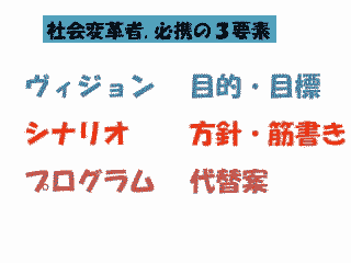 先に示したようなまちづくりを行うためには、言うまでもなく、新たなリーダーが必要となります。リーダーは同時に社会変革者でもあります。 ![]() 私は長野県知事の政策顧問をしていたとき、田中康夫さんとリーダー論を議論していました。下のミッション、パッション、アクションは社会変革者が具備すべき要件と言えます。 これは、政策学校一新塾でこれから首長や議員になる塾生にも絶えず助言、指導しているものです! ![]() 政治家、首長など、地域社会のリーダーにとって最も必要なことは、ミッションであることは言うまでもありません。しかし、いくら崇高な理念、哲学、使命感をもっていたとしても、それがまちづくりの現場で発揮されなければ何にもなりません。 理念を実行に移すためには、間違いなくパッション、すなわち情熱が不可欠となります。ひとはパッションによって、困難を乗り越えミッションを実行に移すことができるのです。 政権交代を果たすころの民主党には、覇気がありましたが、実際に政権を奪取した後は、次々に公約を反故にしたり、蔑にしていました。 ![]() 次に、リーダーはさまざまな困難に対し、逃げてはいけません。当然、恐れず、怯まずの精神が必要となります。 今の巷の政治家を見ていると、ミッション、パッション、アクションがないだけでなく、困難に遭遇すると恐れ、逃げています。これでは政治家失格です。 ![]() さらに、議員と首長が決定的に異なるのは、首長はまちづくりのヴィジョン、シナリオ、プログラムを持たなければならないことです。ヴィジョンは、いうまでもなくまちづくりの目的・目標(将来の望ましい姿)を意味します。 シナリオは、方針、筋書きを意味します。ヴィジョンを具体的プログラムにするために必要な方針、筋書きです。誰がどうやって動くかも含まれます。何から先に予算を付けて実行すべきかといった優先順位も重要となります。 いくらすばらしいヴィジョンがあっても、それを絵に書いた餅とさせないためには、しっかりとしたシナリオが必要なのです。 そして、具体的に行うべきプログラムです。プログラムは個別具体に行う施策、事業を意味します。大切なことは、同じヴィジョンを達成するにも、プログラムはひとつではないということです。複数の案、代替案が必要です。 一つがうまくゆかなくても、それに代わる案があれば、それにトライすることが大切です。日本ではとかく案がひとつである場合が多く、それに挫折するとおしまいとなります。 しかし、一つ目の案がだめでも、二つ目、三つ目の案をあらかじめ考えておけば、すぐにそれらにとりかかることができるのです。 もちろん、それらの案をつくるには、町民への情報公開と町民の参加が不可欠であることは言うまでもありません。 ![]() さらに言えば、当然のこととしてリーダーには、主体性、正義感、自立性、自律性そして強い精神力と責任感が必要です。 同時に、まちづくりには首長の強いリーダーシップとともに、町民の参加が不可欠です。町民の意識が変わり町民がまちづくりに参加しなければ、決してまちは変わらないのです! これは議会についても言えます。 町長や役場任せ、議会任せではなく、町民が主権者として行政や議会を常に監視し、一人一人が自分の問題として新たな町造りに参加することが不可欠なのです。 ![]() つづく |
