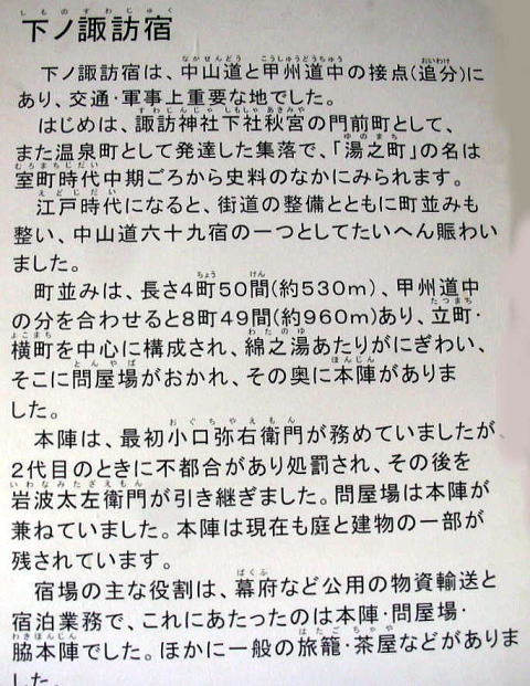 ◆下諏訪宿の概要 その下諏訪宿は諏訪神社の4つある宮のひとつ下社秋宮の門前町として、また温泉宿として発展してきた町です。 歴史的に見ると下諏訪集落は、もともと「湯之町」として室町時代中期頃から発展し、江戸時代になると街道の造営とともに町並みも整備され、中山道69次のひとつの宿として大変賑わった町なのです。 下諏訪の町並みは、長さ約530m、甲州街道中の分をあわせると約960mにも及んでいたそうです。 下諏訪宿の中心は、「綿之湯」あたりとされており、「綿之湯」に問屋と本陣が置かれたとあります。 ![]() 撮影:青山貞一 Nikon Coolpix S8 2015-8-16 出典:下諏訪町立歴史民俗資料館 ![]() 下諏訪宿とその周辺の街道地図 撮影:青山貞一 Nikon Coolpix S8 2015-8-16 ◆下諏訪宿 下諏訪宿は、甲州街道の江戸から数えて三十九番目で終点、中山道六十九次のうち二十九番目にあたる宿場であり、もともと諏訪大社の門前町として、また温泉宿として発展したまちです。 下諏訪町の本陣は、現在の長野県諏訪郡下諏訪町の中心部にあたり、難所であった和田峠の西の入口として、諏訪大社下社の門前町として栄えました。 また、甲州街道の終点でもあり、45軒の旅籠がありました。また古くは鎌倉時代から温泉の利用が確認されており、中山道唯一の温泉のある宿場として、当時の安藤広重などの絵画などには温泉を利用する旅人たちが描かれています。 ![]() 撮影:青山貞一 Nikon Coolpix S8 2015-8-16 ![]() 撮影:池田こみち Nikon Coolpix S6400 2015-5-4 ところ、下諏訪宿の本陣は、岩波家として現在も一部が一般公開されています。この本陣は諏訪大社下社秋宮の境内を借景としており、広大な庭園を持つことが知られていましたが、現在宅地化が進んでおり、その一部のみを見ることができだけです。 現在、本陣は岩波家が管理する旧本陣の一部と、皇女和宮降嫁の際また明治天皇が宿泊した際奥の座敷を「かめや」という旅館で見学することができます。 玄関には、大名家が宿泊している時に掲げる徳川御三家、井伊家などの関札が残っているのを展示してあります。また脇本陣「桔梗屋」「まるや」は旅館として現在も営業しています。 ![]() 現在の下諏訪宿の一部、本陣があった「かめや」旅館の看板が見えます 撮影:青山貞一 Nikon Coolpix S8 2015-8-16 ![]() 現在の下諏訪宿の一部 撮影:青山貞一 Nikon Coolpix S8 2015-8-16 ![]() 昔からつづく塩まんじゅうの老舗、新鶴本店 撮影:池田こみち Nikon Coolpix S6400 2015-5-4 ![]() 昔からつづく塩まんじゅうの老舗、新鶴本店 撮影:青山貞一 Nikon Coolpix S8 2015-8-16 下諏訪の旧称は下ノ諏訪です。下諏訪町は、大規模に観光開発された上諏訪温泉と異なり、小規模な旅館街と入浴施設があるだけで、歓楽街的な雰囲気はありません。 天保14年(1843年)の『中山道宿村大概帳』によれば、下諏訪宿の宿内家数は315軒、うち本陣1軒、脇本陣1軒、旅籠40軒で宿内人口は1,345人であったとされています。一方、下諏訪町立歴史民俗博物館によれば、往事の下ノ諏訪の町並みは、長さ約530m、甲州街道中の分をあわせると約960mにも及んでいたそうです。 つづく |