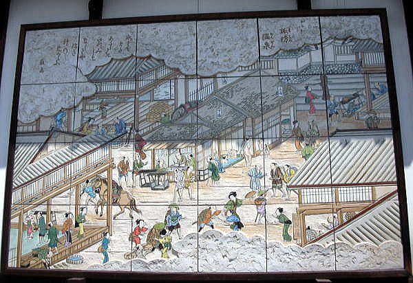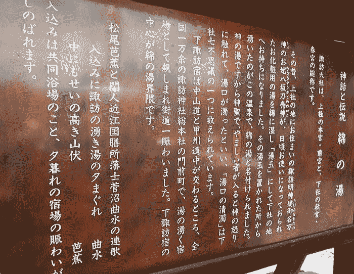 ◆下諏訪宿と温泉 江戸時代の下諏訪宿の本陣兼問屋は、現在、先に視察してきました岩波家とともに、昔から温泉旅館を営んでいる「かめや」の二つに別れています。 一通り岩波家の本陣を視察した後、私達は隣にあります「かめや」に向かいました。 「かめや」に行く途中、以下の石碑に出会いました。「甲州街道中終点 右江戸へ53里11、左えどより55里、正面京都へ77里、中山道下諏訪宿問屋場」とあります。まさに本陣跡です。 ![]() そこで「かめや」に行く前に、このあたりを少し探検することにしました。 下は後で行く下諏訪町歴史民俗博物館の解説板ですが、下諏訪に来る前、グーグル検索でいろいろ調べてみたら、やはり下諏訪宿は、その昔、温泉町として発達した集落で「湯之町」とおいう名が室町時代中期にあったとありました。 ![]() 撮影:青山貞一 Nikon Coolpix S8 2015-8-16 出典:下諏訪町立歴史民俗資料館 「かめや」の前あたりをうろうろと歩いてみると、以下の江戸時代の本陣当たりを大きな絵図にした組み合わせタイル絵図のようなものがありました。 ![]() 撮影:青山貞一 Nikon Coolpix S8 2015-8-16 近づいて見ると以下のような横6枚、楯4枚のタイルを組み合わせた絵図でした。絵には、右上に温泉と書いてあります。やはり、下ノ諏訪町のこの当たりは宿であるととこに温泉でも会ったようです。 中山道69次のなかで宿が同時に温泉となっていたのは、この下諏訪宿だけだったこともわかりました。 ![]() 撮影:青山貞一 Nikon Coolpix S8 2015-8-16 さらに周りを見渡すと、以下のように玄関の上に「湯源湯の綿」という看板がありました。さらに問屋があったところの前に「綿の湯」という石碑のようなものがあります。 すなわち、これらはすべてこの本陣当たりにさまざまな温泉があることの証左であったのです。後日、調べて見たら、下諏訪町には江戸時代より遙か以前から沢山の温泉や温泉宿があったことがわかりました。 ![]() 撮影:青山貞一 Nikon Coolpix S8 2015-8-16 何と、その「綿の湯」は、下の「神話と伝説 綿の湯」にあるように諏訪大社との関連でも由緒ある「湯」のようです。「神話と伝説 綿の湯」を読むと全国に一万以上ある諏訪神社で、湯の湧く宿場として親しまれた街道一賑わったのが下諏訪宿だったとあります。 ![]() 綿の湯の碑 撮影:池田こみち Nikon Coolpix S6400 2015-8-16 ![]() 「神話と伝説 綿の湯」 撮影:池田こみち Nikon Coolpix S6400 2015-8-16 なお、温泉と宿場、当時の風俗などについては、下諏訪町立歴史風俗資料館のところで詳述していますのでご覧ください。 つづく |