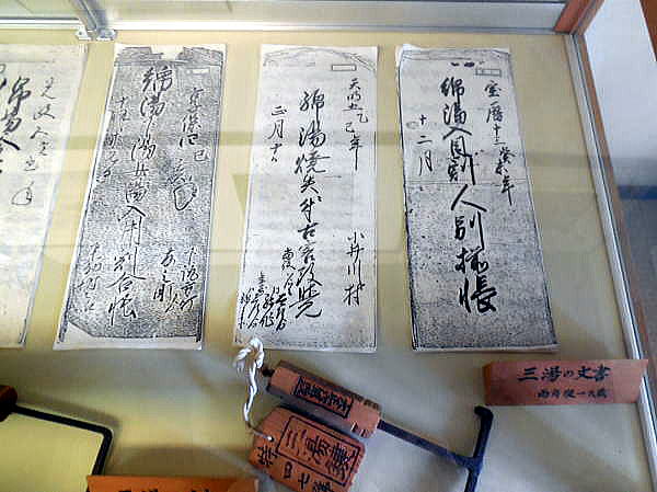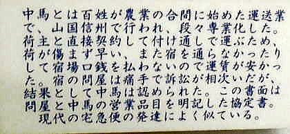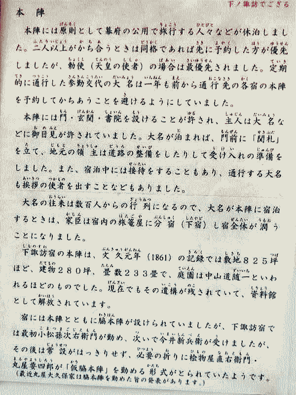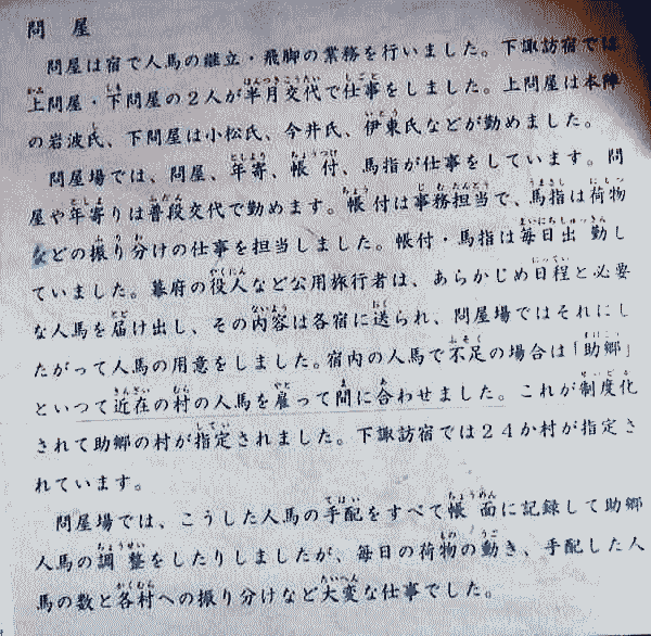 ◆下諏訪町立歴史民俗資料館(宿場と生活) 下は資料館にあった本陣の解説です。デジタル処理で見やすくしました。 ![]() 撮影:池田こみち Nikon Coolpix S6400 2015-8-16 下は資料館にあった問屋の解説です。 ![]() 撮影:池田こみち Nikon Coolpix S6400 2015-8-16 下は江戸時代の旅の携帯用具です。 笠、草鞋、振り分け、ひょうたん、扇子などなどいろいろあります。 ある文献に寄れば、替えのわらじ、道中手形、乾飯・懐中しるこ・味噌などの携帯食、塩、(熱中症という概念はなかったでしょうが塩が不足すると力が出なくなる、あとは懐具合だと思います。とありました。 ![]() 江戸時代の旅の携帯用具 撮影:青山貞一 Nikon Coolpix S8 2015-8-16 ![]() 撮影:池田こみち Nikon Coolpix S6400 2015-8-16 ![]() 撮影:池田こみち Nikon Coolpix S6400 2015-8-16 ![]() 撮影:池田こみち Nikon Coolpix S6400 2015-8-16 下は西餅屋の茶屋とあります。下諏訪から和田峠に行く途中の茶屋のようです。 ![]() 西餅屋の茶屋 撮影:青山貞一 Nikon Coolpix S8 2015-8-16 下は資料館の内部です。壁には笠や草鞋の実物が展示されています。 ![]() 撮影:池田こみち Nikon Coolpix S6400 2015-8-16 下は下諏訪から見た和田峠のはずです。遠くに富士山らしき山が見えます。 ![]() 撮影:青山貞一 Nikon Coolpix S8 2015-8-16 下は下諏訪宿の本陣であり問屋だった亀屋主人の談話筆記とあります。おそらくこのとき、小島兵馬が亀屋の主人であったようです。 ![]() 下諏訪宿の本陣であり問屋だった亀屋主人の談話筆記 撮影:青山貞一 Nikon Coolpix S8 2015-8-16 ![]() 撮影:青山貞一 Nikon Coolpix S8 2015-8-16 ![]() 撮影:池田こみち Nikon Coolpix S6400 2015-8-16 大きなまた重い荷物は写真のように大八車か馬を使って運んでいたと思われます。 ![]() 撮影:青山貞一 Nikon Coolpix S8 2015-8-16 下は宗門御紋の人別帳です。 ![]() 宗門御紋の人別帳 撮影:池田こみち Nikon Coolpix S6400 2015-8-16 ![]() 人別帳 撮影:池田こみち Nikon Coolpix S6400 2015-8-16 ![]() 人別帳 撮影:池田こみち Nikon Coolpix S6400 2015-8-16
