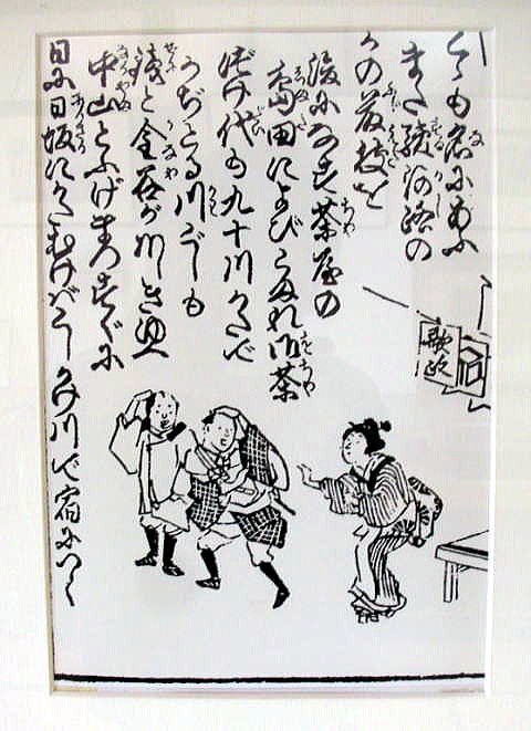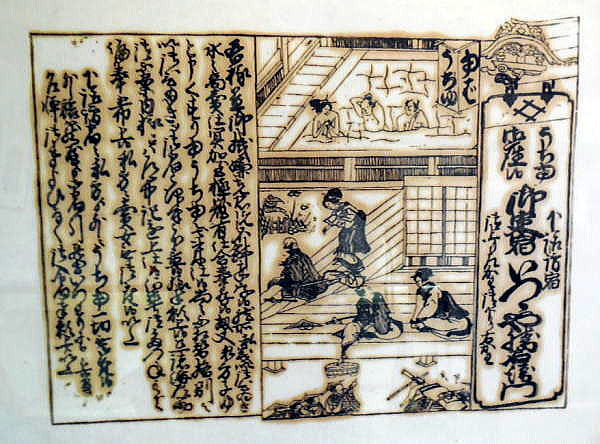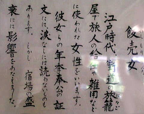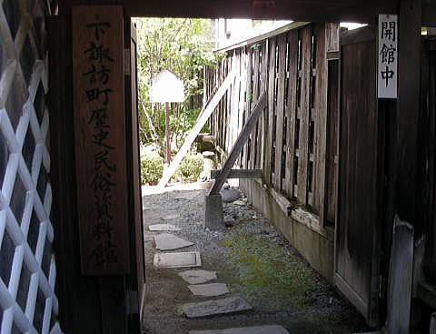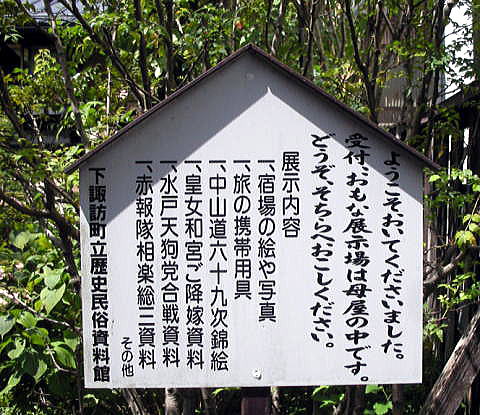 ◆下諏訪町立歴史民俗資料館 下諏訪宿の本陣そして街道やその周辺の景観、町並みなどを視察した後、私達は下諏訪町立歴史民俗資料館に向かいました。 この下諏訪町立歴史民俗資料館は、下諏訪宿のかつての旅籠などの住宅を使い江戸時代の宿場町の歴史や民俗に関連した文物をたくさん展示していました。 資料館にいらした係の男性に伺うと、もともとは入場料をとっていたそうですが、100−200円程度の入場料を取るよりは、多くの町民、観光客にみてもらいたいということで入場は無料にしたそうです。 入館して分かったのですが、展示物が非常に多く、かつ保存、管理もしっかりとされている。しかも写真撮影は自由など、私達のような宿場や歴史文化を現地調査を行っている者にとっては大変ありがたい措置と言えます。しかも、その男性が実質学芸員を兼ねており、何でも質問に答えてくれました。 ![]() 下諏訪町立歴史民俗資料館の看板 撮影:青山貞一 Nikon Coolpix S8 2015-8-16 下諏訪町立歴史民俗資料館は宿場の真ん中にあります。中山道から少し脇道を入り降って行くと木戸があり、開館中の札がありました。いかにも民家のイメージです。 ![]() 下諏訪町立歴史民俗資料館の入口 撮影:池田こみち Nikon Coolpix S6400 2015-8-16 ![]() 下諏訪町立歴史民俗資料館の入口 撮影:青山貞一 Nikon Coolpix S8 2015-8-16 下は展示物の概要です。@宿場の絵や写真、A旅の携帯用具、B中山道69次錦絵、C皇女和宮ご下降資料、D水戸天狗党合戦資料、E赤報隊相楽総三資料などが展示物であることが分かります。 この現地報告では、@からCを中心に報告します。 ![]() 下諏訪町立歴史民俗資料館の案内板 撮影:青山貞一 Nikon Coolpix S8 2015-8-16 下は資料館の庭にあったポンプのようなものです。とくに説明はありませんでした。 ![]() 撮影:青山貞一 Nikon Coolpix S8 2015-8-16 この左から資料館に入ります。資料館はかつての旅籠を使っており、木造二階総建てです。 ![]() 下諏訪町立歴史民俗資料館の中庭 撮影:青山貞一 Nikon Coolpix S8 2015-8-16 ◆宿場の絵や写真、旅の携帯用具 最初は宿場の絵や写真、旅の携帯用具です。 以下は下訪宿宿の解説です。 下ノ諏訪宿は諏訪大社の下社、秋宮の門前町として、また温泉や温泉宿として発展しています。下ノ諏訪集落は、もともと「湯之町」として室町時代中期頃から発展し、江戸時代になると街道の整備とともに町並みもととのってきました。下ノ諏訪宿は中山道69次宿にひとつとして大変賑わったとあります。 また宿場の町並みは、長さの全長が約530m、甲州街道中の分をあわせると実に約960mにも及んでいたそうです。この間、私達は中山道の宿場町を20箇所近く視察してきましたが、これほどの規模の宿ははじめてです。 さらに宿場の中心は「綿之湯」あたりとされています。そこに問屋と本陣が置かれたとあります。これはまさに、先に紹介した本陣そして問屋である岩波家と亀屋を指しています。 ![]() 下ノ諏訪宿の概要 撮影:青山貞一 Nikon Coolpix S8 2015-8-16 先に紹介してきたように、下ノ諏訪宿は当初温泉や温泉宿の「湯之町」として発展してきました。下は江戸時代の温泉付きの旅籠としての下ノ諏訪宿の絵です。混浴の湯もあります。 ![]() 温泉を兼ねた宿 撮影:池田こみち Nikon Coolpix S6400 2015-8-16 下は茶屋の客引き女と旅人です。宿場には、本陣、脇本陣、問屋、旅籠などとともに茶屋もありました。宿泊はせず一服する場所としてどの街道の茶屋も繁盛したようです。 ![]() 茶屋の客引き 撮影:青山貞一 Nikon Coolpix S8 2015-8-16 ![]() 撮影:青山貞一 Nikon Coolpix S8 2015-8-16 飯売(盛)女は、江戸時代、街道の旅籠屋で旅人の給仕や雑用などをした女性を言います。彼女らの年期奉公の証文には、涙なしにはよめないものもあります。しかし、宿場の盛衰には影響を与えていました。 とあります。 江戸に向かって下ノ諏訪の次の和田宿の学芸員から,往事の中山道宿場における飯盛女(めしもりおんな)について、詳細な説明を受けたことがあります。飯盛女は、江戸幕府公認の娼館の公娼に近い存在でした。それぞれの宿の飯盛女の数は幕府により決められていましたが、なかには、もぐりでそれを大幅に上回る宿もあったようです。 ![]() 飯売(盛)女 撮影:青山貞一 Nikon Coolpix S8 2015-8-16 下は温泉宿の風景です。 ![]() 撮影:青山貞一 Nikon Coolpix S8 2015-8-16 以下はWikipediaからの引用です。
