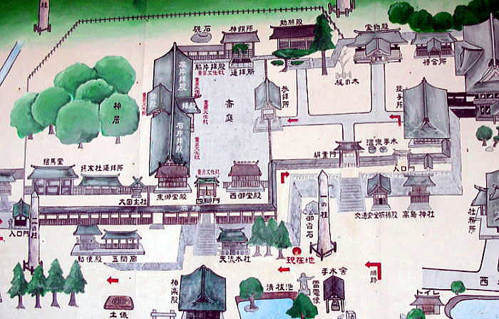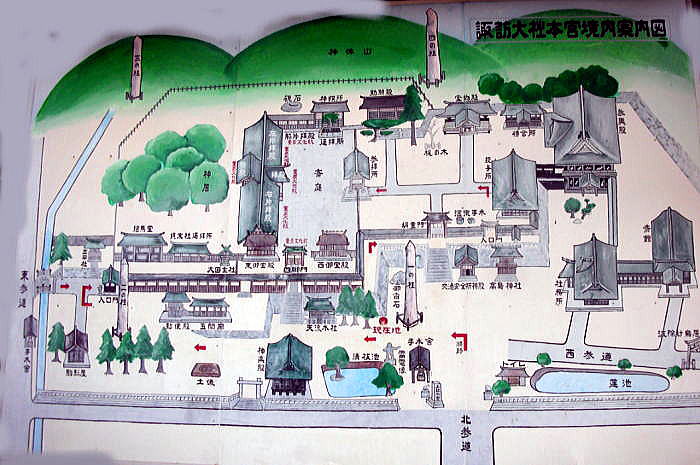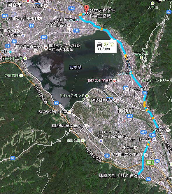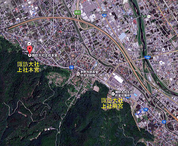 諏訪大社下社の秋宮の参拝、視察終了後、諏訪市にある上社の本宮に向かいました。 以下のルートで車での移動は約25分程度です。途中、諏訪市の中心部を通るので混雑に巻き込まれなければ20分程度で到着します。 ![]() 出典:グーグルマップ 下のグーグルマップの左側にあるのが諏訪大社上社本宮です。この本宮と次に行く前宮はわずか2km程度で車では5分とかかりません。地図は上が北です。 ![]() グーグルマップで示した諏訪大社上社の本宮と前宮 ここでは上社が初めてとなるので、最初に上社そして本宮の簡単な解説を行います。