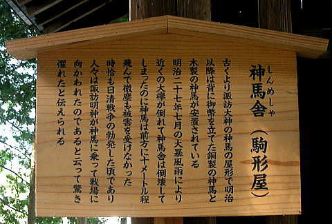 下は神馬舎です。中には二頭の美しいお馬がおりました。 神馬舎 ![]() 撮影:青山貞一 Nikon Coolpix S8 2015-8-16 ![]() 撮影:青山貞一 Nikon Coolpix S8 2015-8-16 ![]() 撮影:青山貞一 Nikon Coolpix S8 2015-8-16 神馬社 古くより諏訪大社の神馬の屋形で明治以降は背に御弊を建てた銅製の神馬と木製の神馬が安置されています。明治27年7月の大暴風雨により近くの大欅が倒れて神馬舎は倒壊してしまったのに神馬は前方に10メートルほど飛んで微塵も被害を受けませんでした。時恰も日清戦争の勃発した頃であり人々は諏訪明神が神馬に乗って戦場に向かわれたのであると言って驚き懼れたと伝えられています。 贄掛けの欅 境内最古の樹木の1つです。 ![]() 撮影:青山貞一 Nikon Coolpix S8 2015-8-16 ![]() 撮影:青山貞一 Nikon Coolpix S8 2015-8-16 下は長い廊下、五間廊です。 五間廊 安永2年(1773年)に造営されています。 ![]() 撮影:青山貞一 Nikon Coolpix S8 2015-8-16 ![]() 撮影:池田こみち Nikon Coolpix S6400 2015-8-16 ![]() 撮影:青山貞一 Nikon Coolpix S8 2015-8-16 五間廊 現在の建物は安永年(1773)の建造であり、廊下洋式切妻造りです。権祝・擬祝・副祝の5官着座のことが見ています。 下は、布橋です。 布橋 古くは大祝のみが渡り、布が敷かれていました。 ![]() 撮影:青山貞一 Nikon Coolpix S8 2015-8-16 下の写真は摂末社群です。 ![]() 撮影:青山貞一 Nikon Coolpix S8 2015-8-16 ◆摂末社(せつまつしゃ) 神社本社とは別に、その神社の管理に属し、その境内または神社の附近の境外にある小規模な神社のことで、摂社と末社と併せた呼称である。枝宮・枝社ともいう。 つづく |