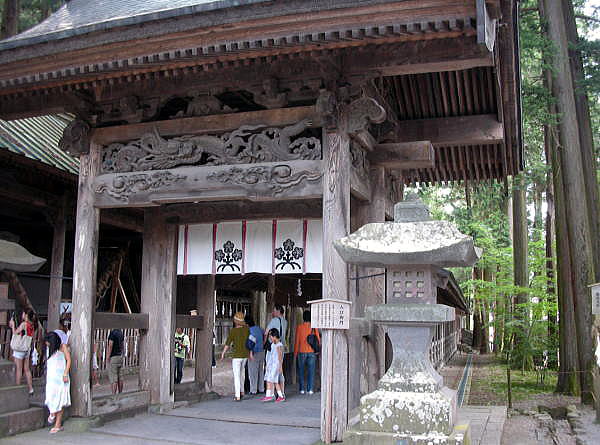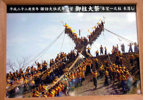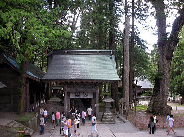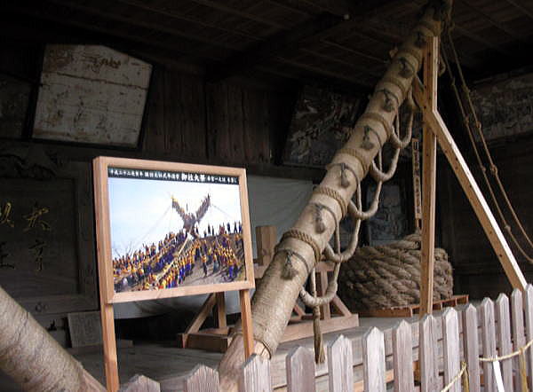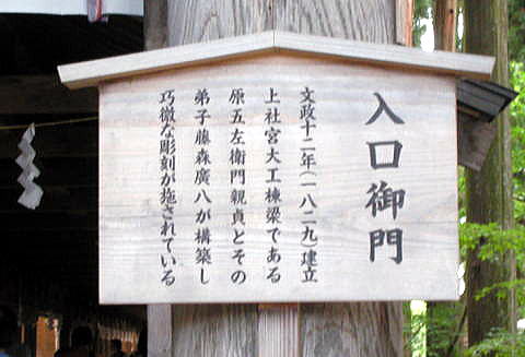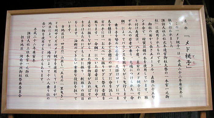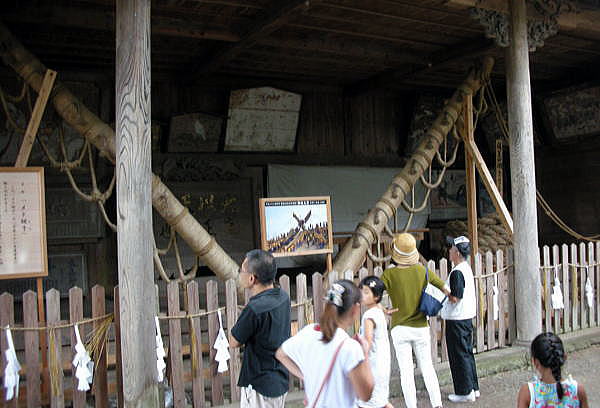 車を駐車場に置き、諏訪大社上社本宮の方に向かって歩きます。途中、下の写真にあるような吉良町の吉良上野介の孫にあたるひとの霊廟がありました。 ![]() 撮影:青山貞一 Nikon Coolpix S8 2015-8-16 鳥居より少し前の所に諏訪大社の大きな石碑があります。この石碑は四宮とも同じもののようです。 ![]() 撮影:青山貞一 Nikon Coolpix S8 2015-8-16 下は諏訪大社の鳥居です。鳥居は、この東参道のこの場所以外に諏訪湖が見える北参道にもあります。 浪除(なみよけ)鳥居 北西方に立つ。昭和15年造営で当社唯一の木造鳥居です。 ![]() 東参道の鳥居 撮影:青山貞一 Nikon Coolpix S8 2015-8-16 鳥居をくぐった後、諏訪大社上社本宮の標識がありました。これも四宮に共通なようです。 ![]() 撮影:青山貞一 Nikon Coolpix S8 2015-8-16 下は諏訪大社上社本宮の全体案内です。 私達は下図の左端から上社本宮に入りました。入ってすぐのところに入口御門があります。 ![]() 撮影:青山貞一 Nikon Coolpix S8 2015-8-16 下の境内地図は主要部のクローズアップです。 上社 本宮のご神紋は下社秋宮と同じ梶の葉ですが、根が4本のところが異なります。 ![]() 撮影:青山貞一 Nikon Coolpix S8 2015-8-16 入口御門 文政12年(1829年)に造営されています。 ![]() 入口御門 撮影:青山貞一 Nikon Coolpix S8 2015-8-16 ![]() 入口御門の解説板 撮影:青山貞一 Nikon Coolpix S8 2015-8-16 入口御門は、文政12年(1829)に建立された上社宮大工頭領である原五佐衛門親貞とその弟子藤森廣八が構築し巧緻な彫刻が施されています。 下は入口御門のクローズアップです。 上社 本宮のご神紋は下社秋宮と同じ梶の葉ですが、根が4本のところが異なります。 ![]() 入口御門 撮影:青山貞一 Nikon Coolpix S8 2015-8-16 入口御門をくぐりすぐを左に行くと、額堂又の名を絵馬堂がありました。そこにはどこかで見たものがおいてありました。 額堂(絵馬堂) 堂内に御柱祭のメド梃子があります。 ![]() 撮影:青山貞一 Nikon Coolpix S8 2015-8-16 ![]() 撮影:青山貞一 Nikon Coolpix S8 2015-8-16 額堂 額堂とは、全国の崇拝者から寄進された絵馬や額を納めており、別名「絵馬堂」とも呼ばれています。その昔、人々は願事をする際に神が乗るための馬を奉納し祈りを下げていました。やがて時代とともに型式が変わり現在のように馬の絵を描いた木札を奉納するようになりました。そうです! 上社の御柱祭で行われるあのものです。その名は、「メド梃子」(メドデコ)といいます。 ![]() 「メド梃子」(メドデコ) 撮影:青山貞一 Nikon Coolpix S8 2015-8-16 下の写真を見れば「メド梃子」(メドデコ)が何かが分かります。 ![]() 「メド梃子」(メドデコ) 撮影:青山貞一 Nikon Coolpix S8 2015-8-16 下は「メド梃子」(メドデコ)を背景にした池田です。 ![]() 撮影:青山貞一 Nikon Coolpix S8 2015-8-16 下は「メド梃子」(メドデコ)の解説です。 ![]() 「メド梃子」(メドデコ)の解説 撮影:青山貞一 Nikon Coolpix S8 2015-8-16