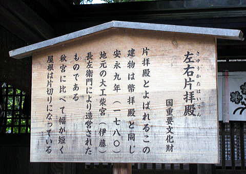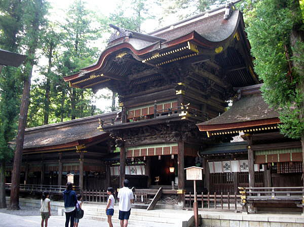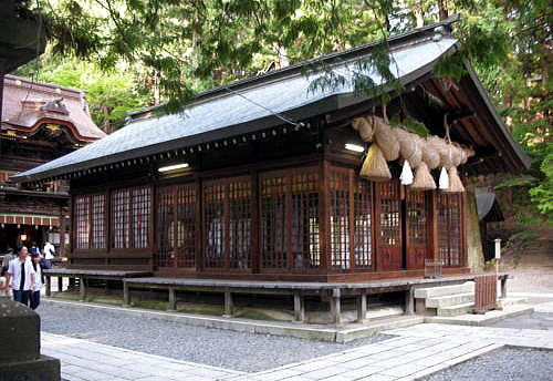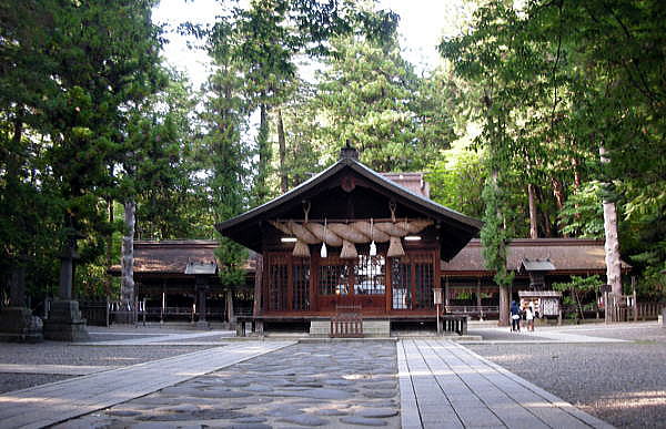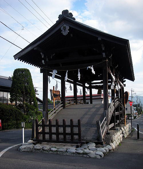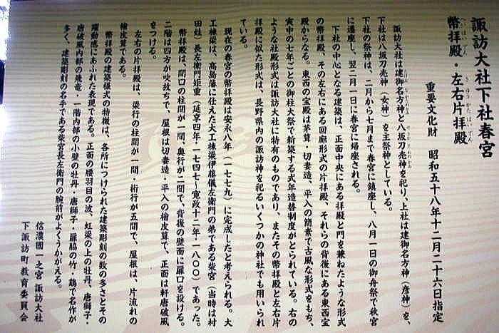 ◆春宮(はるみや) 春宮(はるみや)は、下諏訪の町の北端、秋宮の北西約1.2kmの地に鎮座しています。下社最初の遷座地とされています。西方には砥川が流れています。 毎年2月-7月に祭神が祀られています。境内は社殿3棟が国の重要文化財に指定されています。 車を駐車場に置いて諏訪大社下社の春宮の鳥居から入りました。下は鳥居です。すでに夕方近くになっていたので、春宮にはあまり人気はありませんでした。 鳥居 ![]() 鳥居 撮影:青山貞一 Nikon Coolpix S8 2015-8-16 ![]() 鳥居 撮影:青山貞一 Nikon Coolpix S8 2015-8-16 鳥居の横に諏訪大社の大きな脊柱が建っています。 ![]() 諏訪大社とある大きな石碑 撮影:青山貞一 Nikon Coolpix S8 2015-8-16 鳥居をくぐると左側に水盤舎があります。ここの水は飲めるとあります。 水盤舎 ![]() 水盤舎 撮影:青山貞一 Nikon Coolpix S8 2015-8-16 このあと、下の写真にあります、神楽殿が見えてきます。この配置は他の諏訪大社でも同じです。 ![]() 撮影:青山貞一 Nikon Coolpix S8 2015-8-16 下は神楽殿です。 神楽殿 江戸時代、天和年間(1681年-1684年)頃造営。 ![]() 神楽殿 撮影:青山貞一 Nikon Coolpix S8 2015-8-16 下は斜め横から見た神楽殿です。 ![]() 神楽殿 撮影:青山貞一 Nikon Coolpix S8 2015-8-16 ![]() 撮影:青山貞一 Nikon Coolpix S8 2015-8-16 神楽殿の真後ろに弊拝殿があります。 幣拝殿(重要文化財) 江戸時代、安永9年(1780年)落成。幣殿と拝殿が一体となった二重楼門造りで、左右に片拝殿(重要文化財)が並びます。日光東照宮の陽明門を思わせる荘厳な建築物です。 ![]() 弊拝殿 撮影:青山貞一 Nikon Coolpix S8 2015-8-16 ![]() 撮影:青山貞一 Nikon Coolpix S8 2015-8-16 ![]() 弊拝殿 撮影:青山貞一 Nikon Coolpix S8 2015-8-16 弊拝殿の両側にあるのが左右片拝殿です。 これら三つ、すなわち弊拝殿、左右片拝殿が重要文化財に指定されています。 ![]() 右片拝殿 撮影:青山貞一 Nikon Coolpix S8 2015-8-16 ![]() 左右片拝殿の説明 撮影:青山貞一 Nikon Coolpix S8 2015-8-16 ![]() 撮影:青山貞一 Nikon Coolpix S8 2015-8-16 下は筒粥田です。 筒粥殿 筒粥神事が行われます。 ![]() 筒粥殿 撮影:青山貞一 Nikon Coolpix S8 2015-8-16 ![]() 筒粥殿の説明 撮影:青山貞一 Nikon Coolpix S8 2015-8-16 下は、結びの杉の木です。先で二股に分かれています。 結びの杉 先で二又に分かれている。 ![]() 結びの杉 出典:Wikipadia 一通り視察、参拝し鳥居をでると参道の真ん中に何か構造物があります。近づいてみると、これは下馬橋でした。 下馬橋 下は参道途中にある太皷橋です。 室町時代造営で下社では最古の建造物です。身分にかかわらず馬から下りて渡らなければならないとされ、現在も遷座祭において神輿のみが渡ります。 ![]() 下馬橋 撮影:青山貞一 Nikon Coolpix S8 2015-8-16 ![]() 下馬橋 撮影:青山貞一 Nikon Coolpix S8 2015-8-16 この時点ですっかり夕暮れとなりました。 このあと、私達は旧和田峠を通って国道142号線で北軽井沢にも度枡。 つづく |