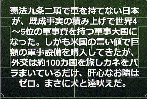 もし、日本のテレビ局、大新聞がまぎれもないこのようなデータを基にした報道を行えば、自民党が続けてきた米国一辺倒の日本の外交、防衛のみならず、経済、社会果ては幸福度に至るまで、明らかに間違っていたことがわかります。また憲法を改正し、戦争ができる国にすることが、さらなる日本の不幸に通ずるかも分かるはずです。