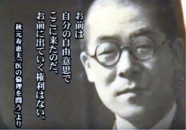 総合目次へ ■4: 実験材料としてのマルタ 〜細菌爆弾開発と野外実験の実態 図らずも731部隊に身を置くことになった秋元。研究会で見た人体実験のフィルムはそれまでにない衝撃を彼に与えた。 「私は一ヶ月のうちにすべてが分かった。私は生き地獄に居た。私は上司に3度抗議した。すると彼は私に言った。お前は、自分の自由意思でここに来たのだ。おまえに出て行く権利はない。」 ![]() 出典:731 極秘細菌戦部隊 TBS 知ってるつもり?! 1988年 戦時下、命令に反することは出来ようはずもない、731部隊第一部血清班班長としての秋元の日々が始まった。彼は一体どのような研究をしていたのか。これは731部隊関係者が書いた論文である。 「異型人血液及ビ獣血液ヲ以テセル輸血例ニ就テ」 ![]() 出典:731 極秘細菌戦部隊 TBS 知ってるつもり?! 1988年 ![]() 出典:731 極秘細菌戦部隊 TBS 知ってるつもり?! 1988年 8歳のサラブレッドの血を人間に直接輸血したらどうなるか、前線で馬の血液しかない場合、人間に馬の血を輸血できるか調べていた。秋元が所属していた第一部では、細菌の基礎研究が行われていた。ペスト、コレラ、チフス、炭疽菌などの細菌が兵器として利用できるかが研究されていた。同時に「マルタ」と呼ばれた捕虜達の管理を行っていた。中国各地で憲兵隊によって微罪で逮捕された人々は領事館の地下などに拘束され、裁判も行われず、次々と731部隊のある平房に送り込まれた。 ![]() 出典:731 極秘細菌戦部隊 TBS 知ってるつもり?! 1988年 ![]() 出典:731 極秘細菌戦部隊 TBS 知ってるつもり?! 1988年 ![]() 出典:731 極秘細菌戦部隊 TBS 知ってるつもり?! 1988年 ![]() 出典:731 極秘細菌戦部隊 TBS 知ってるつもり?! 1988年 ![]() 出典:731 極秘細菌戦部隊 TBS 知ってるつもり?! 1988年 731部隊に送り込むことは、文書にあるように「特移扱」(とくいあつかい)と呼ばれた。 ![]() 出典:731 極秘細菌戦部隊 TBS 知ってるつもり?! 1988年 ![]() 出典:731 極秘細菌戦部隊 TBS 知ってるつもり?! 1988年 元大連憲兵隊准尉 三尾 豊証言 ![]() 出典:731 極秘細菌戦部隊 TBS 知ってるつもり?! 1988年 ![]() 出典:731 極秘細菌戦部隊 TBS 知ってるつもり?! 1988年 「特移扱い」に一旦なったら、それは、そのまま(特説監獄に)送るだけなんですね。にも係わらず、それは大きな功績になるんです。手柄になる。今考えると恐るべきことをやるのに、むしろ、扱う方としては、競ってやっていた。」 平房で医学者に引き渡されたマルタは番号を付けられ、ロ号棟の内側にある特設監獄に閉じ込められた。 そして、窓一つない5mの壁に囲まれた特設監獄からマルタは一人また一人と引き出され、様々な細菌に感染させられ、生きたまま解剖されたのである。こうして3000人以上と言われる人々が二度と帰ることはなかった。 ![]() 出典:731 極秘細菌戦部隊 TBS 知ってるつもり?! 1988年 ![]() 出典:731 極秘細菌戦部隊 TBS 知ってるつもり?! 1988年 こうして731部隊で最も有効な兵器と考えられていたのか、ペスト菌爆弾である。 ![]() 出典:731 極秘細菌戦部隊 TBS 知ってるつもり?! 1988年 ![]() 出典:731 極秘細菌戦部隊 TBS 知ってるつもり?! 1988年 ![]() 出典:731 極秘細菌戦部隊 TBS 知ってるつもり?! 1988年 ![]() 出典:731 極秘細菌戦部隊 TBS 知ってるつもり?! 1988年 ![]() 出典:731 極秘細菌戦部隊 TBS 知ってるつもり?! 1988年 第四部では細菌培養室でペスト菌を月に300kgも培養、同時に、感染媒体であるネズミが大量に飼育されたという。 ![]() 出典:731 極秘細菌戦部隊 TBS 知ってるつもり?! 1988年 ペストに感染させた蚤が焼け死なない様に、爆発しても火の出ない陶器製の爆弾が第三部で開発された。そして、実戦を行う第二部では、人間を生きたまま一定間隔で杭に縛り付け、上空から細菌爆弾を投下する実験が行われたのである。 ![]() 出典:731 極秘細菌戦部隊 TBS 知ってるつもり?! 1988年 ![]() 出典:731 極秘細菌戦部隊 TBS 知ってるつもり?! 1988年 部隊の秘密を守るため、隊員同士の情報交換は固く禁じられ、自らの研究がどのように兵器に利用されるのか、隊員達はほとんど知らなかった。秋元寿恵夫自身も罪の意識を振り払い、研究に没頭するうち、いつしか心は麻痺していった。 ![]() 出典:731 極秘細菌戦部隊 TBS 知ってるつもり?! 1988年 ところがある日、研究棟であるロ号棟の廊下から中庭を覗いた秋元はひとつの光景に目を奪われることになる。中庭に椅子をだし、編み物をする婦人。膝にはあどけない女の赤ん坊が抱かれていた。ロ号棟の中庭にあるのは特設監獄。この母と子はマルタ、実験材料だったのだ。 その光景は、秋元の中に残っていた人間の心を呼び覚ましたのだ。彼は後に語っていた。 「これが吾が命かと思うと苦しさはいや増した。次第に科学者として生きることと、人間として生きることとの間に、超えがたい溝が生じて来たのであった。」(秋元寿恵夫、「医の倫理を問う」より) 明治41年長野市に生まれた秋元寿恵夫、父親(正親)は学校の教員。その所為か少年時代から彼の身の回りに常にあったのは書物であ