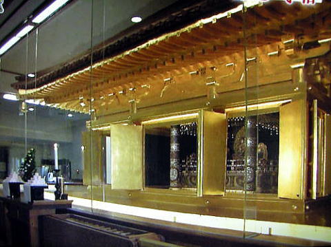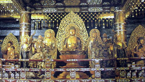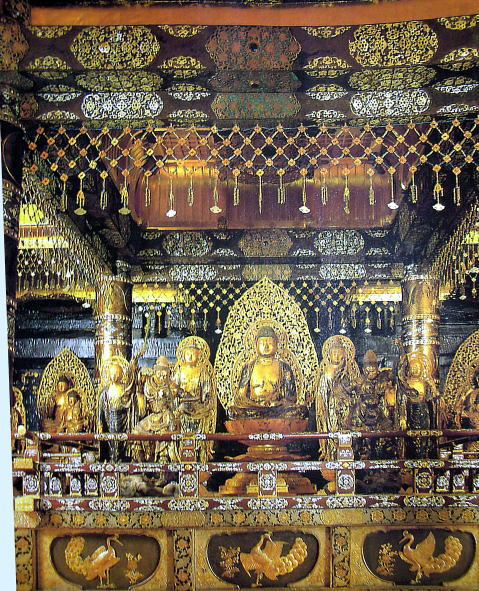 ●そして金色堂へ 中尊寺の本堂の近くに、金色堂がある。 ただし、私が45年以上前に見た金色堂はなく、1965年建設につくられた鉄筋コンクリート造の覆堂の中にあり、ガラスケースに納められて外気と遮断されていた。 金色堂関連施設は、以下の拝観券発行所で大人ひとり800円の拝観券を購入する。 撮影:青山貞一 Digital Camera Nikon CoolPix S8 拝観券購入後に最初に入るのが、讃衛蔵という宝物殿の一種である。ここも一切撮影禁止となっていた。 ![]() 撮影:青山貞一 Digital Camera Nikon CoolPix S8 その後、金色堂に向かう。まるで遊園地である。 ![]() ●金色堂 ![]() ![]() 出典: Wikipedia 以下、金色堂関連解説の出典は Wikipedia 金色堂は奥州藤原氏の初代藤原清衡により建立された。棟木に天治元年(1124年)の年次と共に「大檀散位藤原清衡」「女檀 安倍氏 清原氏 平氏」が物部清国を大工として建立した旨の墨書があり、この年が建立年とされている。 2006年に奈良文化財研究所は、解体修理時に取り外されていた金色堂の部材をデジタルカメラを使用した年輪年代測定法で調査した。その調査報告によれば、金色堂に使用された木材の伐採年代は1114年から16年頃とされ、上記の建立年代は科学的にも裏付けられた。 奥州藤原氏滅亡直後の文治5年(1189年)、中尊寺経蔵別当心蓮が源頼朝に差し出した「寺塔已下注文」(『吾妻鏡』所収)には、当時残存していた中尊寺の堂宇が書き出されているが、その中に「金色堂 上下四壁は皆金色なり」云々の記載があり、当時から「金色堂」と称されていたことが分かる。 ![]() 出典:テレビ東京、世界遺産となった中尊寺特集 金色堂 中尊寺金色堂は、岩手県西磐井郡平泉町の中尊寺にある平安時代後期建立の仏堂である。奥州藤原氏初代藤原清衡が天治元年(1124年)に建立したもので、平等院鳳凰堂と共に平安時代の浄土教建築の代表例であり、当代の建築、美術、工芸の粋を集めたものとして国宝に指定されている。堂の所有者は宗教法人金色院である。 金色堂は、中尊寺山内のやや西寄りに東を正面として建つ、方三間(正面、側面共に柱間が3間)、平面の1辺が5.5メートルの小型の仏堂である。堂は、1965年建設の鉄筋コンクリート造の覆堂(おおいどう、さやどう)内にあり、ガラスケースに納められて外気と遮断されている。 ![]() 出典:トランヴェールの2011年9月号 仏像 堂内安置の仏像について見ると、中央壇、右壇、左壇共に阿弥陀三尊像(阿弥陀如来坐像、観音菩薩立像、勢至菩薩立像)を中心に、左右に3躯ずつ計6躯の地蔵菩薩立像(六地蔵)、手前に二天像(持国天、増長天)を配し、以上11躯の仏像から構成される群像を安置している。 ただし、右壇では二天像のうち右方(向かって左)の増長天像が失われているので、堂内安置の仏像は計32躯である。また、右壇の阿弥陀如来像は金色堂本来の像でなく、後世他所から移入された像であると見なされており、金色堂本来の仏像は計31躯ということになる。 中央壇と左壇の阿弥陀如来像は膝前で両手を組む定印(じょういん)を結ぶが、右壇の阿弥陀如来像は右手を挙げ左手を下げる来迎印で、像高も一回り小さく、金色堂本来の像でないことは明らかである。像高は中央壇阿弥陀如来像が62.3センチメートル、左壇阿弥陀如来像が65.4センチメートル、右壇阿弥陀如来像が48.9センチメートルで、その他の諸像の像高は60 - 70センチメートル台である。 ![]() 出典:テレビ東京、世界遺産となった中尊寺特集 須弥壇内に安置される遺体は、中央壇が藤原清衡、右壇が2代基衡、左壇が3代秀衡とするのが通説である。清衡は大治3年(1128年)没、基衡は保元2年(1157年)頃没、秀衡は文治3年(1187年)没で、約30年の間隔を置いて没している。 須弥壇上の3組の仏像群も、上記3名の没年の前後に造立されたものと推定されているが、現状の仏像の配置は必ずしも平安時代のままではなく、後世に入れ替わった部分が多いと見なされている。各像はいずれも寄木造または一木割矧造で、漆箔を施し、用材はカツラ、ヒバ、ヒノキの3種がある。各像の様式、用材、木寄せ法等から、おおよその制作年代が推定されている。 阿弥陀三尊像に着目すると、中央壇の阿弥陀如来像は典型的な定朝様(じょうちょうよう)で、定朝から3代目の円勢などの円派仏師の作風に通ずるところがあり、12世紀前半の制作と見なされることから、中央壇の本来の本尊と思われる。中央壇の両脇侍像も阿弥陀如来像と一具の作とみられる。 ![]() 出典:テレビ東京、世界遺産となった中尊寺特集 ![]() 金色堂の螺鈿(らでん) 出典:テレビ東京、世界遺産となった中尊寺特集 螺鈿 螺鈿はおもに漆器や帯などの伝統工芸に用いられる装飾技法のひとつ。貝殻の内側、虹色光沢を持った真珠層の部分を切り出した板状の素材を、漆地や木地の彫刻された表面にはめ込む手法、およびこの手法を用いて製作された工芸品のこと。螺は貝、鈿はちりばめることを意味する。使用される貝は、ヤコウガイ(夜光貝)、シロチョウガイ(白蝶貝)、ク