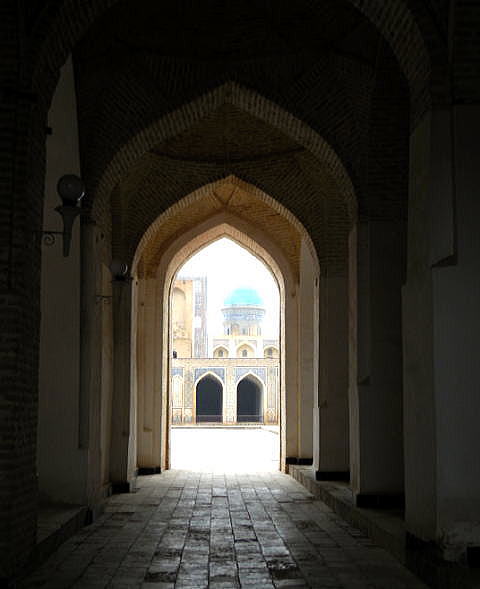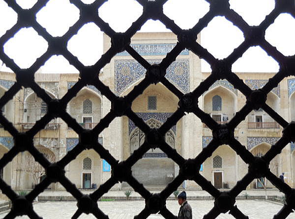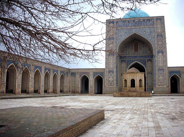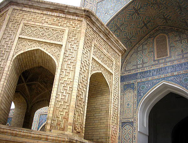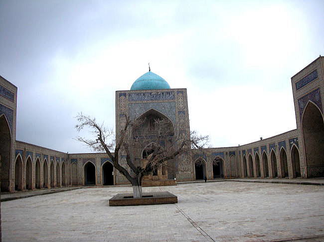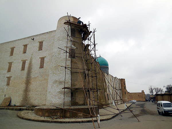 | 総合メニュー(中央アジア) タキ アブドゥールアジズ・ハン・メドレセ ウルグ・ベグ・メドレセ カラーン・モスク カラーン・ミナレット ミル・アラブ・メドレセ 私達がブハラで滞在したホテルは、カラーン・ミナレットやカラーン・モスクのすぐ隣にあります。 下はウルグベグ・メドレセを視察後、カラーン・モスクに向かう途中で撮影した写真です。 ミル・アラブ・メドレセの外壁は写真のように工事中でした。今回私達がウズベキスタンに来たのは真冬の2月、この時期は完全にシーズンオフです。おそらくこの種の改修、修復工事はシーズンオフに集中的に行っているようです。 ![]() ミル・アラブ・メドレセの外壁の修復工事 撮影:池田こみち Nikon Coolpix S6400 2015-2-25 下はカラーン・モスク、カラーン・ミナレットに行く途中にあるミル・アラブ・メドレッセの外壁です。かなり風化、破壊が進んでいるようです。また何回かの修復により外壁がつぎはぎとなっていることがわかります。 ![]() ミル・アラブ・メドレセの外壁 撮影:池田こみち Nikon Coolpix S6400 2015-2-25 下がカラーン・ミナレット(尖塔)とカラーンモスクの入口です。 下の写真にあるカラーン・ミナレット(尖塔)は「チンギスハーンがブハラに攻め入ったとき、あまりにも素晴らしい構造物なので破壊しなかった」という代物です。確かに素晴らしいです。 ![]() カラーン・ミナレット(中央の塔)とカラーンモスク(右) 撮影:池田こみち Nikon Coolpix S6400 2015-2-25 下は数あるブハラの世界遺産のなかでも最も秀逸なカラーン・モスクのエントランスです。キリスト教のカテドラル、教会のファザードに相当する部分です。上の写真の右側にある建築物です。 ![]() カラーン・モスクのエントランス 撮影:池田こみち Nikon Coolpix S6400 2015-2-25 下の写真はカラーンモスクの内部です。 ![]() 撮影:池田こみち Nikon Coolpix S6400 2015-2-25 ところでカラーン・ミレットは、尖塔の高さ47m、地下が10mもある巨大な構造物です。そのとなりにある大きなメドレセは、ブハラにある現役の2カ所のひとつで、昨日訪問した時はちょうど授業の最中でした。 いずれにしても、シルクロードの中心の一つ、ブハラの旧市街はイスラムの精神文化は衰退しているようですが、往時のまちなみと景観は健在であり、中央アジアのかけがえのない記憶だけでなく実在する場所であることに変わりありません。 皮肉にもソ連時代の文物の破壊はCISロシアになってから180度変わり文物の保存になっています。 また現在、ウクライナ問題でロシアは、欧米、日本から激しい経済制裁を受けていますが、ウズベキスタンを中心に中央アジア諸国、コーカサス諸国はロシア支援で様々なモノの輸出特需となっており、ウズベキスタンからは主に野菜を輸出しているそうです。 ブハラの旧市街に来ていると、400年一日のような「悠久の歴史」を感じるとともに、西欧近代化が人間社会にもたらしたものの大部分が資源、エネルギーの浪費であるとさえ思えます。 ブハラは、以前でかけたポーランドの 古都クラクフやバルト三国の古都など、キリスト教諸国の古都を訪問したときのトキメキとはまったく異なった衝撃をうけました。これは青山が過去出かけたイスラム系の国々とも違う大きな衝撃を受けています。 ◆カラーン・モスク Kalyan Mosque 下は、宿泊先ホテルからほど近い、カラーン・モスク、カラーン・ミナレット、ミル・アラブ・メドレセなどが集中する地域の衛星写真です。ウズベキスタンでは、モスクなどの宗教施設、公共施設それに一般家庭まで中庭付きとなっています。 この航空写真を見ると、ブハラの歴史地区にあっても、ほぼすべての建築物に中庭があることがよく分かります。 下の写真では、ほぼ中央にカラーン・ミナレットがあります。 ![]() 出典:グーグルアース 衛星写真 ![]() 出典:グーグルアース 衛星写真 多くの建築物が立ち並ぶブハラの中でもカラーン・モスクはひときわ目をひくランドマークそしてモニュメント的な建築物といえるでしょう。 古来よりこのモスクは、住民、市民誰もが礼拝できる金曜モスクです。 カラーン・モスクが現在の敷地に最初に建てられたのは8世紀が最初ですが、最初の建築物は13世紀のチンギスハーンのモンゴル来襲時にことごとく破壊されています。 現在のカラーン・モスクは16世紀、シャイバーニ朝の時代に建てられたものです。 名前が示すとおり大変大きな建築物で、1万人もの信者が同時に礼拝できます。チンギス・ハーンがブハラを征服するとき、宮殿と間違えてモスクを破壊したという話もあります。 宗教が否定されたソ連時代、このモスクはは何と倉庫として利用されたそうですが、1970年代より改修が進められ、ウズベキスタン独立後、再びモスクとして利用されるようになっています。 ![]() カラーンモスク 撮影:青山貞一 Nikon Coolpix S8 2015-2-25 ![]() 撮影:池田こみち Nikon Coolpix S6400 2015-2-25