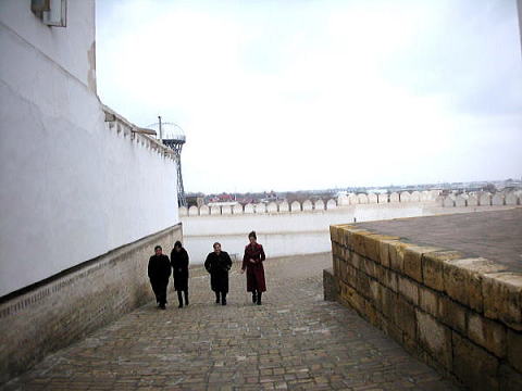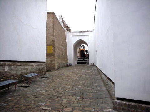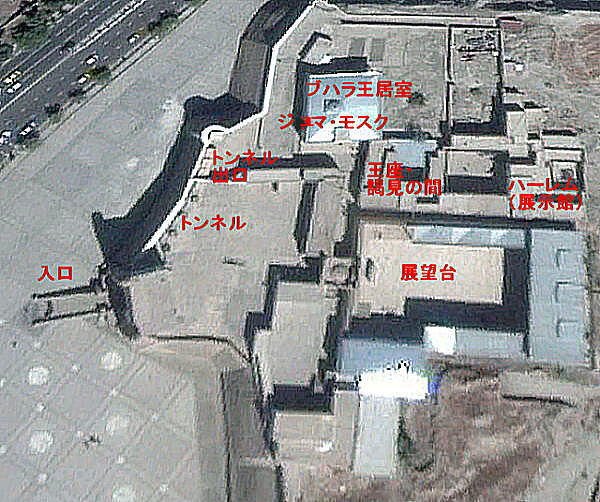 | 総合メニュー(中央アジア) アルク城に向かう 概要と歴史 アルク城博物館1 博物館2 博物館3 博物館4 博物館5 アルク城内には、王の関連するモスクや職務室、戴冠式、謁見の間や軍関係者、職人のワークショップ、陶磁器、アーセナル、宮廷人とその親族のための家、衣服、カーペット、食器、宮殿の宝物の保管スペースなどがあります。往事には約3,000人がアルク城(要塞)に住んでいと言います。 ◆アーク要塞への入口 アーク城には、城壁の一部がスロープとなっており、そこを上りキップ売場(受付)に行きます。下はアルク城(要塞)の入口を真横から撮影したものです。 ![]() アルク城(要塞)の入口 撮影:青山貞一 Nikon Coolpix S8 2015-2-25 下がアルク城(要塞)の正面入口です。 ![]() 撮影:青山貞一 Nikon Coolpix S8 2015-2-25 この先にアルク城入城切符売場があります。 切符売場では、入場券以外にカメラでの撮影、さらにビデオでの撮影などについてそれぞれ別途料金を支払います。これは東欧やバルト三国でよく経験したことです。三脚を使うかどうかによっても料金が異なります。せっかくなので、デジカメ、ビデオの料金まで支払いました。 下は上空から見たアルク城博物館の見取図です。 現在、アルク城として残っていて公開されているのは、下の見取り図に赤色で示したものだけです。 ![]() 上空から見たアルク城博物館の見取図 出典:グールマップ 入口で各種料金を払いアルク城の内部に入ります。 入口から城の内部に入る途中、上のアルク城博物館の見取図にある薄い暗いトンネルのような回廊を通ります。 アルク城の門の入口は、かつて多くの囚人が収容された監獄であり、入口を入ってすぐ左側に、当時の様子を人形で伝える展示物があります。ドイツやスコットランドなど欧州の城にも必ず監獄はあり、見学に行くと監獄や牢がひとつの見物となっていますが、アルク城の場合、入口近くに囚人が収容された監獄がありました。 下がその監獄です。 ![]() 撮影:青山貞一 Nikon Coolpix S8 2015-2-25 そこを抜けると下の写真のようになだらかなスロープがあります。 実はこのとき、下の写真にいる黒いジャンバーと黒いズボンの40歳代とおぼしき男性が、日本語で話しかけてきました。最初は無視していたのですが、親しげに話しかけてくるとの、英語の説明内容が非常に詳しいこともあり、アルク城の学芸員かと思いました。そこで、いろいろと質問しました。 下の写真の男性です。 ![]() 撮影:青山貞一 Nikon Coolpix S8 2015-2-25 ウズベキスタンではめずらしく流ちょうな英語を話すこの男性は、アルク城の専属学芸員と言って良いほどウズベキスタンの歴史文化、とりわけブハラの歴史や文化に詳しいのです。そのようなこともあり、彼に説明を受けながらアルク城内を散策していました。 下はトンネルを出て右折したところです。この先に、ジュマ・モスクがあります。 ![]() 撮影:青山貞一 Nikon Coolpix S8 2015-2-25 ![]() 撮影:青山貞一 Nikon Coolpix S8 2015-2-25 ここでブハラハーン国の概要について再度紹介しておきます。