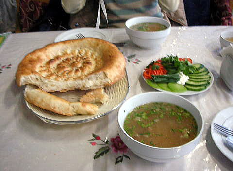 ブハラに限らずウズベキスタン人の主食は、ナンという名のパンです。下の写真の左側の丸いパンです。 どのレストランに行っても、何を頼んでも必ずこのナンがついてきます。味や歯ごたえは間違いなくパンです。これは欧米のレストランに行くと、何はともあれパンが最初に出るのと同じです。 写真には頼んだ牛肉のスープそれにサラダが写っています。サラダはニンジンやキュウリなどが主となっていました。スープは旨味があり結構濃厚で美味でした。ブハラにはいわゆるプロフもあるようです。 ![]() 頼んだ牛肉のスープそれにサラダ 撮影:青山貞一 Nikon Coolpix S8 2015-2-25