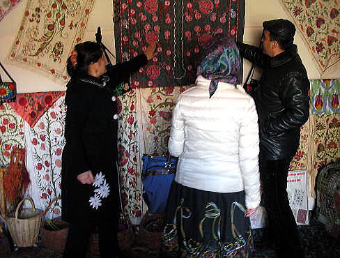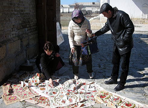下はおそらく刺繍における花のモチーフのデザインのようです。 ![]() 宮殿内のスザニ博物館にて 撮影:池田こみち Nikon Coolpix S6400 2015-2-26 ![]() 宮殿内のスザニ博物館にて 撮影:池田こみち Nikon Coolpix S6400 2015-2-26 下は絨毯に使うような大きなスザニです。 ![]() 宮殿内のスザニ博物館にあったスザニ 撮影:池田こみち Nikon Coolpix S6400 2015-2-26 ![]() 宮殿内のスザニ博物館にあったスザニ 撮影:池田こみち Nikon Coolpix S6400 2015-2-26 ![]() 宮殿内のスザニ博物館にあったスザニ 撮影:池田こみち Nikon Coolpix S6400 2015-2-26 ![]() 宮殿内のスザニ博物館にあったスザニ 撮影:池田こみち Nikon Coolpix S6400 2015-2-26 ![]() 宮殿内のスザニ博物館にあったスザニ 撮影:池田こみち Nikon Coolpix S6400 2015-2-26 下は炬燵(こたつ)にかける布団のようなスザニです。 ![]() 宮殿内のスザニ博物館にあったスザニ 撮影:青山貞一 Nikon Coolpix S8 2015-2-26 ![]() 宮殿内のスザニ博物館にあったスザニ 撮影:青山貞一 Nikon Coolpix S8 2015-2-26 ![]() 宮殿内のスザニ博物館にあったスザニ 撮影:青山貞一 Nikon Coolpix S8 2015-2-26 スザニ博物館からの帰りスザニばかりを扱うショップがありました。私立学芸員によれば、国立の宮殿のなかにあるショップなので、安くて良い品がそろっているとのことです。 ![]() 宮殿内のスザニ博物館の近くにあったスザニショップ 撮影:青山貞一 Nikon Coolpix S8 2015-2-26 そこで池田がいろいろ品定めし、小さなスザニを買うべく交渉に入りました。私立学芸員君も参加しての交渉となりました。値段を聞くと、どう見ても高いので、もっと安くならないかと言うと、幾らなら買うかと、いつものやりとりになりました。 そこで青山が「半額なら勝手も良い」というと、女性は携帯電話でボスと値段の交渉経過を伝えますが、「半分にはならない」とのことでした。 そこで「では仕方ないので、帰ろう」と言って3人で帰ると、どこまでもこの女性が追っかけてきました。 しかし、買わないで正解でした。サマルカンドのレギスタン広場にある大きなメドレセの一階奥にある本格的なスザニの店で見たら、ほぼ同じようなスザニがはじめから半額だったのです(笑い)。 ![]() 宮殿内のスザニ博物館の近くにあったスザニショップ 撮影:青山貞一 Nikon Coolpix S8 2015-2-26 つづく |