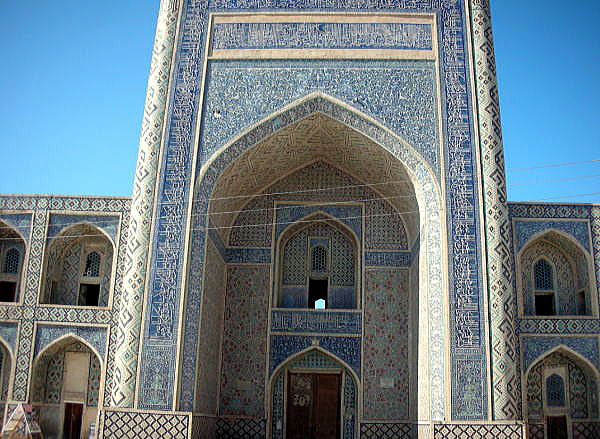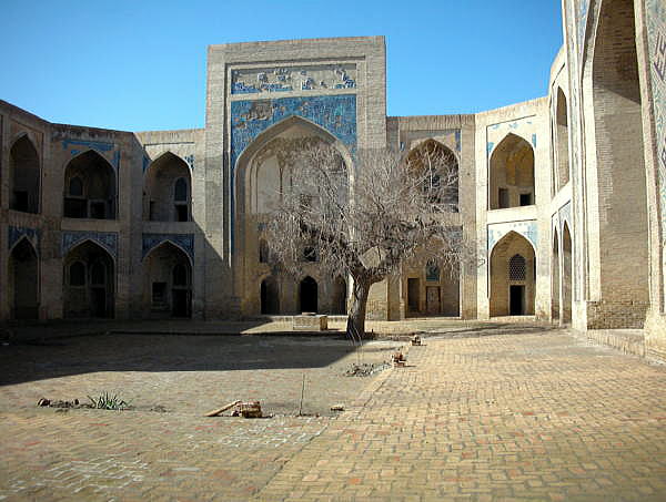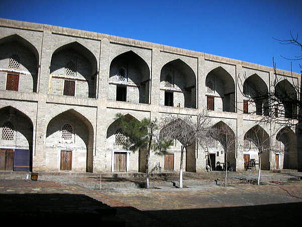 | 総合メニュー(中央アジア) 古い二つのメドレセ1 古い二つのメドレセ2 市民がかよう金曜モスク ブハラハーン、夏の宮殿を視察した後、私たちは私立学芸員に先導され、アルク城の南西にある古い2つの向かい合うメドレセに向かいました。 この古い2つの向かい合うメドレセは、下の写真にあるようにアルク城のすぐ南西にあります。 ![]() ふたつの古いメドレセ 出典:Wikimapia 下はグーグルアースで、ふたつの古いメドレセ(左右にあります)を拡大した航空写真です。まさに二つのメドレセは向かいあって存在しています。 ![]() ふたつの古いメドレセ 出典:グーグルアース ふたつの古いメドレセは、入口に掛けられていた札から以下の文字が読み取れます。 ひとつは、ABDULLOXON MADRASASI XVI DAVLAT MUHOFAZASIGA LINGAN、もうひとつはMODARIXON MADRASASHI XVI です。 ![]() 撮影:池田こみち Nikon Coolpix S6400 2015-2-26 アブドラ-ハン マドラサ、ブハラ・コシの意味は<ダブル:二つの>という意味です。 つまり、私たちが現地で見たモダリ・カーン(ハーン)とアブドラ・カーン(ハーン)の二つのマドラサは二つで一体となっているもののようです。 二つのメドレセは上のグーグルアースの写真にあるように、向かい合って建っていました。 写真で向かって左のモダリ・カーンマドラサは、イスラム暦974年(西暦1566年~1567年)に建設されています。 この年号は、上の写真にあるように、入口に貼り付けられたタイルに記載された詩の中にありました。豪華な正面のファサードをもつマドラサの中では、ごく質素なモデルです。 もうひとつのアブドラ・カーンマドラサは1558年~1590年に建てられています。グーグルアースの写真で右側にあるメドレセです。 ブハラのモダリ・カーン マドラサは、中央アジアにおける特徴的な建築物の一つです。 ここでは、建築家は、勇敢にも建築計画における教会法の決まりを逸脱し、一般的な建築構造における新しい構造を含め、矩形の建物のアウトラインを越えて、建物内部の移動空間をアシメトリー(不均衡)としていました。 したがって、中庭には12の側面から光を取り入れるキューポラがある広いホールがあます。≪Abdullah-カーン スカイ-ライト≫として知られています。 下の写真は、12の側面から光を取り入れるキューポラがある広いホールです。 ![]() 12の側面から光を取り入れるキューポラがある広いホール 撮影:青山貞一 Nikon Coolpix S8 2015-2-26 ホールは、2階建てとなっており、20のhydjrsを結合しています。hydjrsの意味は不明です。 ![]() 撮影:池田こみち Nikon Coolpix S6400 2015-2-26 ![]() 撮影:青山貞一 Nikon Coolpix S8 2015-2-26