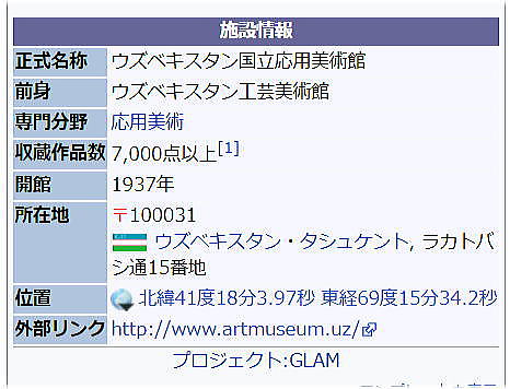 | 総合メニュー(中央アジア) 首都タシケントへ 到着、一旦ホテルへ 国会議事堂 アミール・ティムール広場 アミール・ティムール博物館 ウズベキスタン外務省迎賓館 プロムナードギャラリー シャラフ・ラシドフ銅像 ウズベキスタン国立歴史博物館 ナボイ・オペラ・バレイ劇場 ヤッカサライ墓地 国立応用美術館 夕暮れの独立広場 予備調査を終わって 次はウズベキスタン国立応用美術館です。 ◆ウズベキスタン国立応用美術館 ![]() 出典:Wikipedia 1927年にタシュケントにおいてウズベク・ソビエト社会主義共和国国内の芸術家が集まり展覧会が開催されました。以降、この展覧会は定期的に開催されるようになり、「ウズベキスタン国立展覧会」として開催されるようになりました。 その後、展覧会で展示される対象は手作りの刺繍工芸、木彫りの彫刻、絨毯、宝石など応用美術の様々な分野へと拡大されてゆきました。 この展覧会で展示された美術品を集め、ウズベキスタン工芸美術館が1937年7月に設立されました。 1960年、ウズベキスタン工芸美術館はウズベキスタン応用美術常設展示館へと改名されました。 1997年、美術館はウズベキスタン共和国文化省の管轄下に入り、ウズベキスタン国立応用美術館へと改名されました。 館内では、ドゥッピ (Do'ppi) などの伝統衣装の帽子、ネックレスや髪飾りなどの貴金属製品などが展示されています。 館内は伝統工芸を展示している区画、20世紀に制作された絨毯や帽子などの伝統衣装を展示している区画、現代美術との融合により新たな創作を行なっている作品群のある区画の3つの区画に分かれています。 館内スペースの関係から7,000点以上の美術品を展示することはできないものの、職人の製作のもと収集品は増加しています。 ![]() ウズベキスタン国立応用美術館 出典:Wikipedia Source:Wikimedia Cmmons ![]() ウズベキスタン応用美術館に展示されている、20世紀初頭の伝統衣装 Source:Wikimedia Cmmons つづく |
