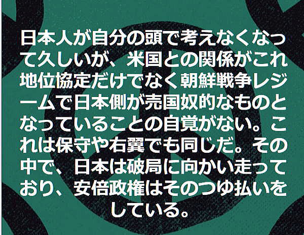 | 上記は日刊ゲンダイの矢部浩治氏インタビューの要旨です。要旨は青山がまとめました。 矢部氏は米国との防衛関係で日本と韓国は似た様な状況にあるものの全く違うのは、韓国人は米国との関係を知っているのに対し、日本人は米国との関係を知らないということです。その違いは絶大な意味をもちます。 , ということは、政治的に右、左、中道、リベラルもなく、日本人、日本の政治家、日本の政党は、明示的、すなわち日米地位協定だけでなく、明示されていない両国の関係(朝鮮戦争レジーム)についても、完全に米国の属国であることを自覚していないということになります。 , それほど日本国民だけでなく政治家までが自分たちが米国の「売国奴」となっていることを自覚していないことになります。 , となると、集団的自衛権や安保法制を認めるか否かで、保守と護憲を二分すること以前に、今の日本の国民と政治家は、すべからく米国への売国奴であり、さらに独立国としての自覚がまったくないことになります。当然、これは自民、維新、希望やその政治家も同じです。 , それにしても岸信介が残した「朝鮮戦争レジーム」をそのままに、安倍政権が売国奴防衛政策や外交を継続していることは、今や最大の国難ということになります。本来、安倍首相がすべきことは、「朝鮮戦争レジーム」の解消としての、日朝平和条約の締結です。 , このままズルズルとしていると米国の軍事の手先となるだけでなく、日本は核配備され、最終的に核戦争の一大現場となり、未曾有宇の人的、国土的被害を米国のために被ることとなる可能性があります。今の安倍政権は、自覚なく、ひたすらその道を邁進していると言えのです。 ![]() |