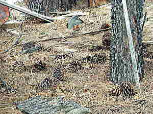 タホ町の松林の下に大きな松ぼっくりがたくさん落ちている。永年松葉を使ったダイオキシンや重金属調査をしてきた池田さんはこれに感激! 日本の赤松の松ぼっくりに比べると5倍ほど大きい。