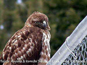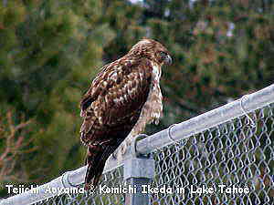 その一角に行くと、フェンスの上に猛禽類の鳥が止まっていた。5mくらいまで近づいてもまったくとびたたない。これにはおどろきだ。猛禽類には間違いない。タカの一種であるノスリの亜種かチュウヒのように思えるが、現在確認中である。