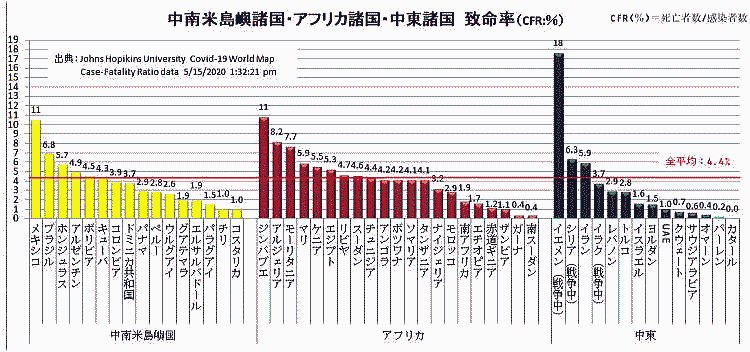 出典:青山貞一・池田こみち 致命率(CFR)による世界各国・地域別 COVID-19リスク総合評価2020-5-20 上記の中南米島嶼国、アフリカ、中東の地域グループは、世界平均値(CFR=4.4)を超える国数の数の割合は21%~33%と上記のグループよりもさらに低い。 これらの諸国は、G7やEUのように、自由主義経済やそれに準ずる経済制度をとっていないことが理由にあると想定される。またアフリカ、中東諸国は、イスラム系の国が多く経済とは別に、一般的に国境を超える人口移動は上記グループに比べ少ないと推定される。 また中南米島嶼国にはキューバを筆頭に、医療、医療制度が拡充している国が多い。米国の映画監督、マイケル・ムーア氏の作品「シッコ:SiCKO」では、、監督がキューバ国内を回りながら、キューバの医療の現場を紹介し、いかに自国(米国)とことなるかについて紹介している。キューバの医療は、早期段階でメキシコなど中米を除き、他の南米諸国にも移転されており、それが今回のCOVID-19問題で発揮されたと考えられなくもない。 中東諸国で平均値を超えているのはいずれも戦争中の国であり、特にイエメンはすさまじい状況になっており、悲劇である。 青山、池田は今回の調査対象国の多く(半数以上)に現地調査著、学会発表などで訪問しているが、上記のコメントでは、それらを踏まえている。 |