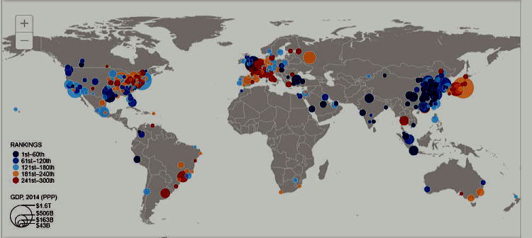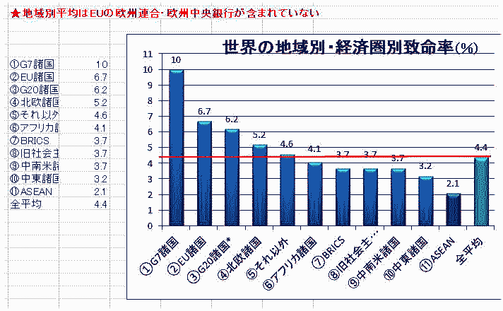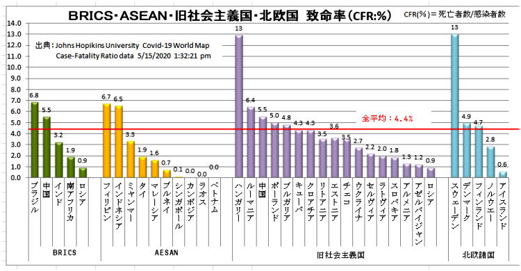 出典:青山貞一・池田こみち 致命率(CFR)による世界各国・地域別 COVID-19リスク総合評価2020-5-20 上のグラフはEU加盟国のCFRをぬきだしズームアップしたものである。 上のグラフから分かるように、フランス(CFR=19)からスペイン(CFR=12)までの非常にCFRが平均値より高い諸国に比べると、スロベニアからドイツまでの諸国は、一気にCFRが低くなっており、さらにクロアチアからマルタまでの諸国CFRは平均値以下にありチェッコからスロバキアの旧社会主義国(ルクセンブルグは別)はEUのCFRを押し下げているといってよく、これは特筆すべきことである。 EUの加盟国には、1990年代初期ののベルリンの壁の崩壊以降、東欧州、バルカン半島国で旧社会主義国の多く加盟してきたが、ハンガリー以外の旧社会主義国のCFRはいずれもフランスの1/4から1/10(スロバキア) と低く、EU諸国の平均を下げる原動力になっている。 ④BRICS・ASEAN・旧社会主義諸国・北欧諸国のCFR グラフ4 BRICS(40%)・ASEAN(20%)・旧社会主義諸国(29%)・北欧諸国(60%) ()内はCFR平均値超の国の割合 ![]() 出典:青山貞一・池田こみち 致命率(CFR)による世界各国・地域別 COVID-19リスク総合評価 2020-5-20 上記のグループは、世界平均値(CFR=4.4)を超える国数の数の割合の割合は20%~60%、北欧諸国を除くと20%~40%と低い。 旧社会主義国については、EUのところで触れたが、青山、池田はロシア、中国、バルト三国(リトアニア、ラトヴィア、エストニア)、ポーランド、チェコ、スロバキア、クロアチア、モンテネグロなどに現地調査、などで何度も足を運んできたが、こと医療については、西側諸国に比べ医師、看護師、病床数、教育、保健制度、関連費用などどれをとっても、卓越していると推測ている。 また、これらの諸国は、一言で言えば、G7、G20、EUの多くの国々のように、自由主義経済の立場を鮮明にとっていないことが低い理由にあると想定される。それは中国、ロシアの場合でも同じである。中国、ロシアのグローバリズムは一言で言えば、「節度あるクレバーなグローバリズム」であり、欧米のような多国籍企業などによるグローバリズムとは明らかにことなるからと推察できる。 事実、中国はあれほどのパンデミックの元となった国でありながら、CFR=5.5、またロシアはCFR=0.9である。これは平常時の医療に加え、緊急時の医療の凄さに見事にあらわれているといってよい。中国ではわずか10日程度で膨大な病床を新たに建設し、ロシアもやはり短期間に巨大な病床を建設し稼働させている。 一方、CFR平均値を60%が超えている高い北欧諸国は、社会民主主義的システムをベースにしつつも、「原則として自由主義に類するあるいは準ずる経済システムを採用している。そのあたりが、幸福度ランキングなどで世界で5位、10位以内にいる北欧諸国だが、スウェーデン、デンマーク、フィンランドは図らずも、COVID-19で墓穴を掘ったかもしれない。ノルウェー、アイスランドは見事であり、さすがである。 またASEAN諸国の中では、タイの医療体制に見られるように、欧米日本を超える先進医療を売り物して、患者を呼び込むまでの国があり、今回のCOVID-19のCFRからみると、その実力がデータとして明らかになっているといってよいだろう。 一方、CFRは世界300都市の2000年~2014の経済成長率(1人当たりGDPppp 、雇用)を示したものである。調査は米国ブルッキングス研究所が行い英文報告を出している。 以下の図は、その結果を世界地図に落としたものだが、地図中ブルー系が経済成長率がプラスの都市、一方赤系はマイナスの都市である。一目して分かるように、CFRが高い西欧諸国及び米国東海岸、日本、南米のブラジル、アルゼンチンなどは赤色が卓越している。つまりこれらの地域は長期にわたり経済成長が停滞しており、賃金なども低く据え置かれていることを示す。 一方、中国全土、東南アジア、西アジアなどのブルーの都市、都市圏は経済成長が顕著であり、今回のCOVID-19感染の発祥地の中国はじめ、東南アジア、西アジアなどは西欧諸国のようなCFR悪化状態はなかったことになる。 おそらく中国が短期間にCOVID-19の危機的状況を克服できたのは、世界300都市の上位50の大部分を占める大都市の圧倒的な経済成長率がその基盤になっているものと推察できる。 ![]() 出典:青山貞一・池田こみち編 「一人当たりGDPと雇用の伸び率で見た世界300都市経済圏ランク」, 原典、米国ブルッキングス研究所,2018/7/28 ⑤中南米島嶼国・アフリカ諸国・中東諸国のCFR グラフ5 中南米島嶼国(33%)・アフリカ諸国(32%)・中東諸国(21%) ()内はCFR平均値超の国の割合