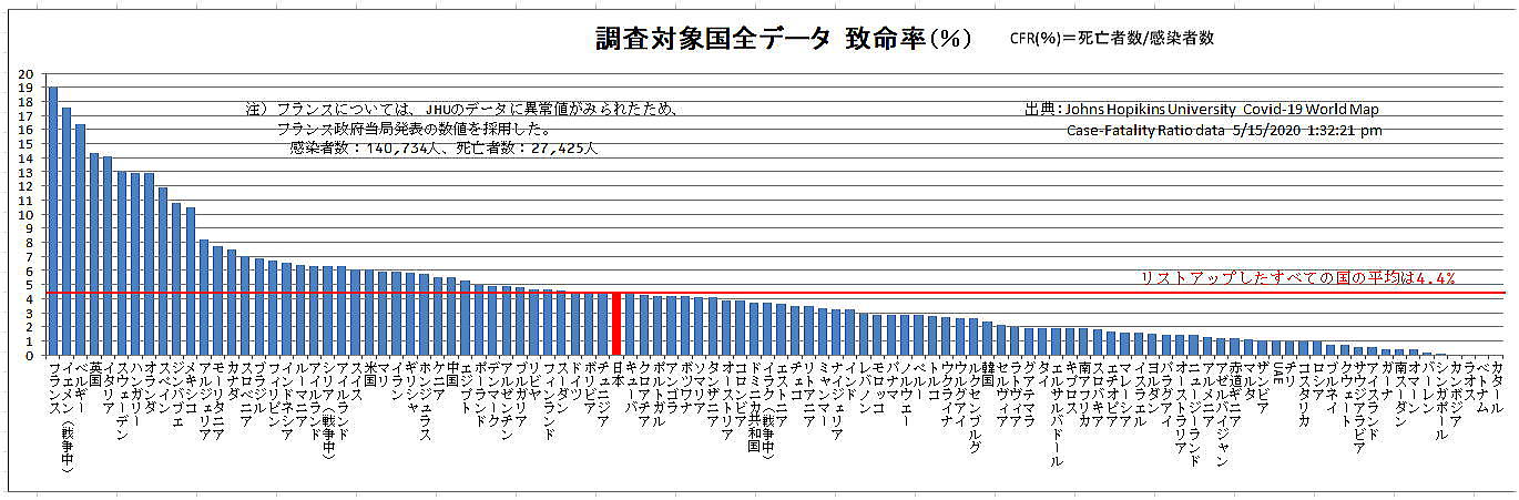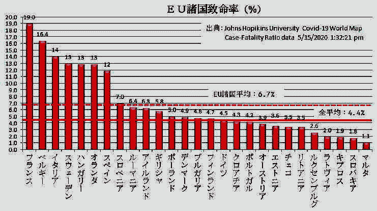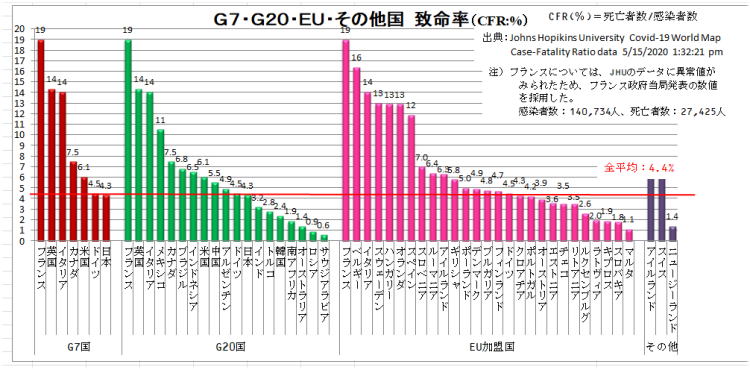 ◆調査対象国 次に調査の対象だが、世界106ヵ国とともに、以下に示す国家グループを対象としている。但し、国際機関、事務局は含めていない ①G7加盟国(7ヵ国) ②EU加盟国(27ヵ国) ③G20加盟国(19ヵ国) ④北欧諸国(5ヵ国) ⑤それ以外国(3ヵ国) ⑥アフリカ諸国(25カ国) ⑦BRICS加盟国(5ヵ国) ⑧旧社会主義諸国(17ヵ国) ⑨中南米島嶼諸国(15ヵ国)、 ⑩中東諸国(14ヵ国) ⑪アセアン加盟国(10ヵ国) 注)一部、11グループ間で重複している国がある。 また調査対象国は全部で106である。 ◆調査年月日時 調査日は、2020年5月15日、UTC 1時32分である。 ◆基本データの出典 国別のCOVID-19感染者数、死亡者数などの基本データの出典はJohns Hopkins University(JHU,米国)である。 ただし、フランスのJHUの感染者数がWHOやフランス政府保健当局発表の感染者数と大きく異なっていたので、フランスについては、フランス政府保健当局発表値を用いている。その他はすべてJHUである。 ◆赤色線 赤線はCFRの全世界平均値である。今回の場合CFR=4.4である。各グラフではこれを赤線で入れている。 主要国の第一位、フランスの致命率は、約19%なので、100人中19名が死亡していることを意味する。実際には、フランスの調査日の感染者数は、140,734人、死亡者数は27,425人である。 ◆調査結果 ①世界106カ国の平均CFR(フラフは巻末参照) 世界106ヵ国のCFRの全平均は、4.4 ちなみに、日本のCFRは、4.3 なので、世界のほぼ平均と言える。 ②世界の地域別・経済圏別の致命率(CFR) 以下のグラフの上にある数値及び左のグループ説明の右にある数値はCFR=死亡者数/感染者数(CaseFatality Rare)である。 グラフ1 世界の地域別・経済圏別の致命率(CFR) ![]() 出典:青山貞一・池田こみち 致命率(CFR)による世界各国・地域別 COVID-19リスク総合評価 2020-5-20 上記グラフ1は、調査対象とした世界における11の地域、経済等のグループ別の致命率(CFR)の結果である。 G7が世界平均の2.27倍で最も高く、次いでEU諸国、G20、北欧諸国、それ以外の先進諸国が世界平均値を超えていた。北欧諸国、それ以外の先進諸国を除く、G7、EU、G20はいずれも、経済開発志向のグローバル経済の国家グループであると言える。 グローバル経済はいうまでもなく、資本、もの、情報に加え人の国際移動を自由そして活発とするものであり、CFRが高いのはいわば当然であると言える。 一方、アフリカ諸国、BRICS、旧社会主義諸国、中南米諸国、中東諸国、ASEAN諸国は世界平均値の4.4を下回っており、とくに中東諸国、ASEAN諸国のCFRは中東諸国は3.2%、ASEAN諸国は2.1%と低くなっている。 旧社会主義圏の多くはEUに加盟したが、G7諸国のように経済成長至上主義でない点がこの結果に表れているとも言える。 以下は上記の国別詳細結果。 タイトル末尾の()内の%の数字は、CFRの世界平均値以上の割合を%で示している。 たとえばG7の86%は、G7参加国の86%がCFR=4.4の平均値を超えていることを意味する。 ③G7、G20、EU諸国の国別CFR グラフ2 G7(86%)・G20(58%)・EU諸国(59%)・その他国(67%) ()内はCFR平均値超の国の割合 ![]() 出典:青山貞一・池田こみち 致命率(CFR)による世界各国・地域別 COVID-19リスク総合評価 2020-5-20 上記の調査結果から明らかなように、G7の欧米諸国の致命率は非常に高いが、とりわけフランスの致命率はCFR=19で世界最高となっている。フランスでは感染者の5人に1人が死亡していることになる。なお、フランスとイタリアは、G7、G20、EUに属しており、それぞれのグループのCFR平均値を押し上げている。 COVID-19感染による死亡は、既往症、持病、とくに呼吸器系疾病をもつひとと、ともに、高齢者に多いことがデータから分かっている。その2つの観点のうち、高齢化から見ると、フランス、イタリア、スペインなど西欧ラテン諸国(但し、ポルトガルは別)のCFRが高いのは、高齢化が大きく原因していると考えられる。 以下は、左からフランス、イタリア、スペインの人口ピラミッドである。いずれも高齢化が深刻なことがわかる。 ![]() フランスの人口ピラミッド イタリアの人口ピラミッド スペインの人口ピラミッド 出典:青山貞一・池田こみち、人口ピラミッドから見える世界各地、国家の現状と将来 2019年2月24日、独立系メディア E-wave Tokyo 一方、EUから離脱した英国だが、CFR=14と非常に高い。英国はG7、G20に属している。またカナダもG7、G20に属しているがCFR=7.5と高い。 G7、G20に属する米国の感染者数は世界的に群を抜いて多いこともあり、結果的にCFR=6.1とフランス、イタリア、英国、カナダなどと比べるとCFRは低いといえる。 なお、G7のうち、ドイツ、日本はCFR=4.5、CFR=4.3と世界の平均値近くで上記の諸国よりCFRはかなり低い。 日本は、この間、PCR検査数の低さが内外の識者から指摘してきされてきたが、仮に検査数が多くなっても、感染者(陽性者)及び死亡者数の如何でCFRが変わるので、直ちに日本のCFRの妥当性を評価するのは困難である。言えることは、欧米諸国のようにPCR検査ができず、実際にはCOVID-19陽性でありながら、自宅などで亡くなるひ