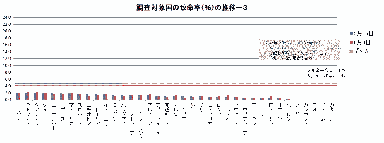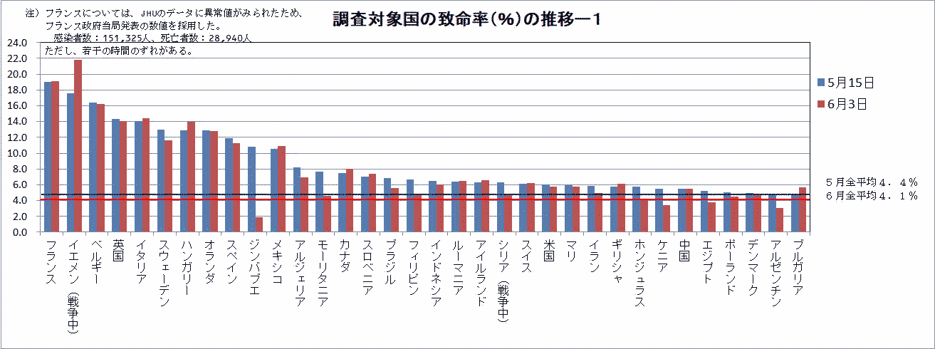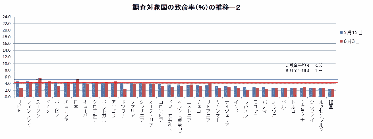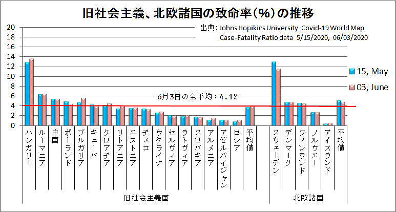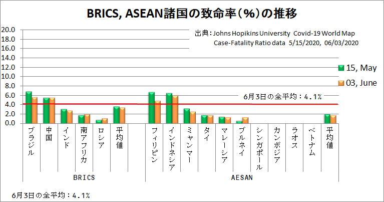| キーワード:新型コロナウイルス、COVID-19、致命率、CFR、死亡者数/感染者数、 リスク総合評価、Case Fatality Rate、世界各国、世界地域、日本、 G7,G20、ASEAN、旧社会主義諸国、北欧諸国、非同盟国、 中南米カリブ諸国、アフリカ諸国、中東諸国、第二回目調査 第一回目調査結果は以下 ◆致命率(CFR)による世界各国・グループ別COVID-19リスク評価 青山貞一・池田こみち(環境総合研究所顧問 はじめに 本調査の目的は世界各国。地域、経済グループ等を対象に、致命率(CFR:死亡者数/感染者数)を明らかにすることである。本調査はその第二回目である。 本稿では、致命率(CFR: Case Fatality Ratio)をCOVID-19感染がもたらすリスクの代表的な指標として、総合評価を行うこととした。それは、単なる感染者数、死亡者数だけでなく、感染者がその国、地域で死に至った背景、具体的には、今回のようなパンデミックに対応できる救急搬送体制から病院数・病床数・医療設備・医師・看護士などの医療リソースの充足度、また、医療体制の有無、さらには国や自治体のリスク管理政策の妥当性など、如何に死者を減らせるか、医療崩壊に至らずに済むかを反映した指標であると考えたからである。 その結果、これまで分からなかったCOVID-19がもたらす「医療に関するカントリーリスク」についての国際比較が可能となりつつある。 ◆COVID-19リスクの調査評価指標 本調査では、2020年6月3日時点での105各国の致命率を求め、評価している。第一回目は2020年5月15日である。 以下は致命率とは何かの説明である。 まず、類似の指標として死亡率があるが、致命率と死亡率との関係は以下の通りである。分母が罹患数の場合が致命率、分母が人口の場合が死亡率である。ここでは、世界各国のCOVID-19に感染した人を対象としているので、致命率となる。 ![]() <用語解説> 致命率 (CFR: case fatality rate) は、疫学において特定の疾病に罹患した母集団のうち、その感染が死因となって死亡する割合。致命率は通常、%で表されリスクの測定値を表す。 なお、致命率は英語ではCase Fatality Ratioであり、略称CFRである。 CFRはさまざまな目的に援用できるが、これが増えるのは、総じて死亡者が増加することの警報である。 CFR(致命率)は、各国の救急搬送(ネットワーク)、救急医療、病床数、院内リスク管理体制、医師・看護数、既往症・持病者対応、高齢者対応など院内感染、医療崩壊に通ずる重要な観点の総合指標と言える指標である。 ◆調査対象国 次に調査の対象だが、第一回同様、世界105ヵ国とともに、以下に示す国家グループを対象としている。但し、国際機関、事務局は含めていない ①G7加盟国(7ヵ国) ②EU加盟国(27ヵ国) ③G20加盟国(19ヵ国) ④北欧諸国(5ヵ国) ⑤それ以外国(3ヵ国) ⑥アフリカ諸国(25カ国) ⑦BRICS加盟国(5ヵ国) ⑧旧社会主義諸国(17ヵ国) ⑨中南米島嶼諸国(15ヵ国)、 ⑩中東諸国(14ヵ国) ⑪アセアン加盟国(10ヵ国) 注)一部、11グループ間で重複している国がある。 また調査対象国は全部で105である。 ◆調査年月日時 調査日は、2020年6月3日、UTC 1時32分である。 ◆基本データの出典 国別のCOVID-19感染者数、死亡者数などの基本データの出典はJohns Hopkins University(JHU,米国)である。 ◆赤色線 赤線はCFRの全世界平均値である。今回の場合CFR=4.1である。各グラフではこれを赤線で入れている。 ◆第二回調査により判明した顕著な傾向と事実 1.105カ国の全平均は4.4%から4.1%へと若干下がっている。 感染者数が増加し、一方、死者数の割合が小さくなっている。 2.地域別の傾向は大きく変わらない。 にもかかわらず、前回から今回にかけての伸び率では、日本は大幅にCFR平均値が増えている。 調査日のグループ・地域別CFR平均値(%)