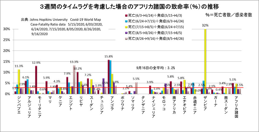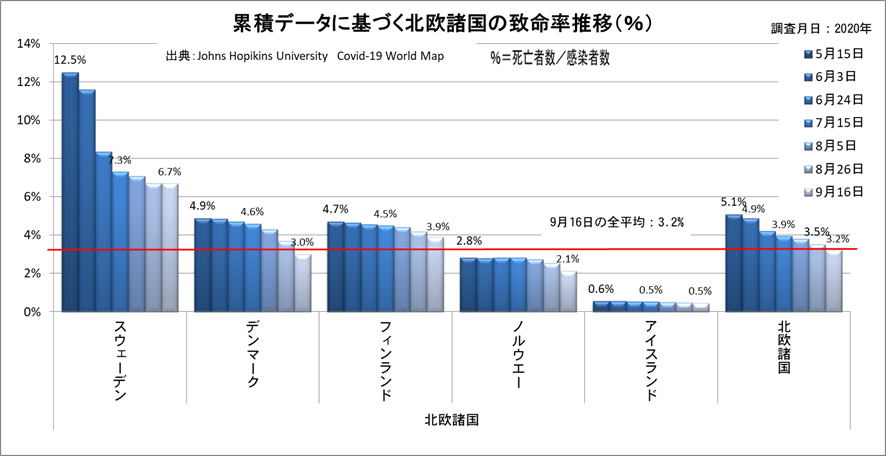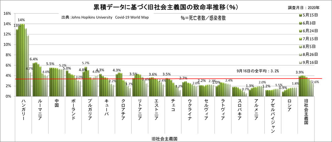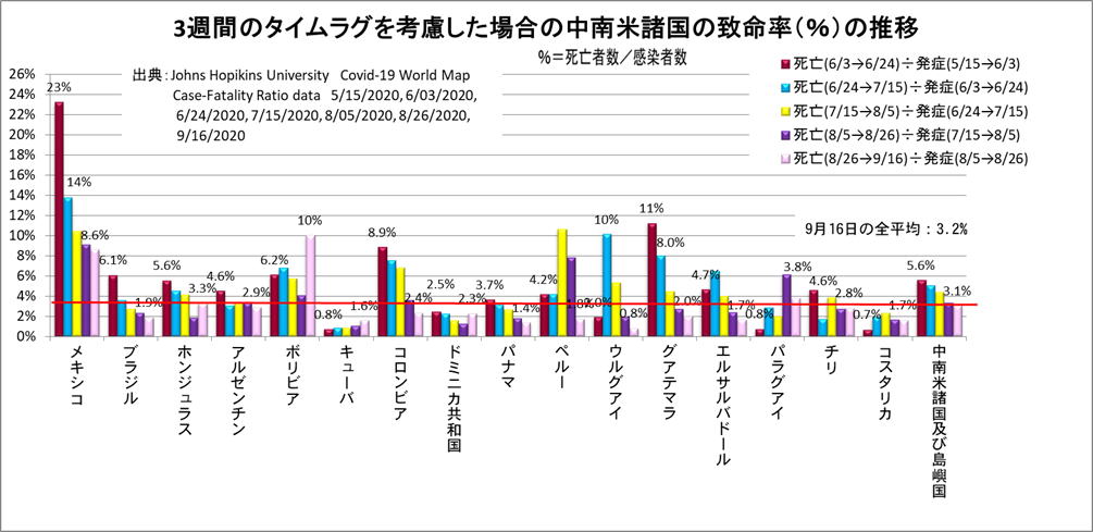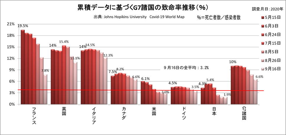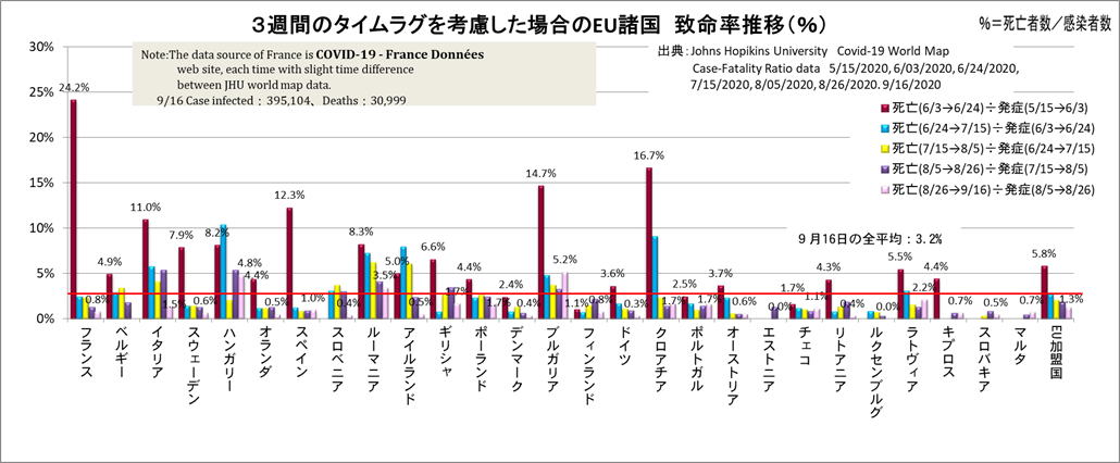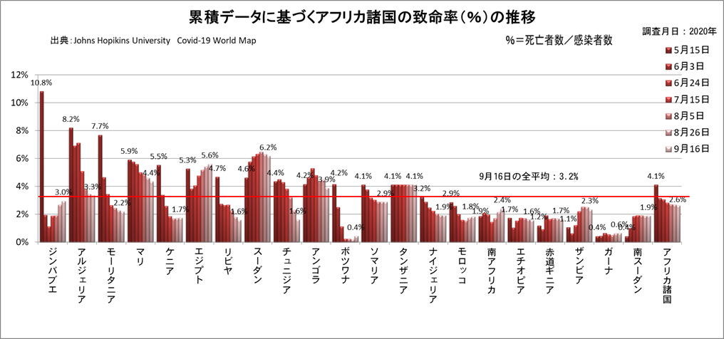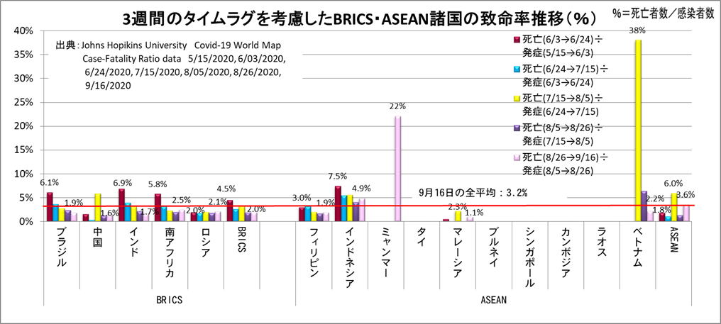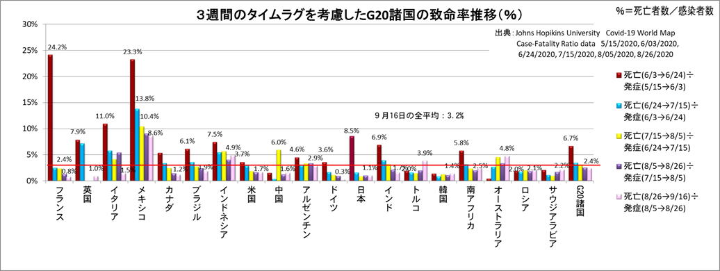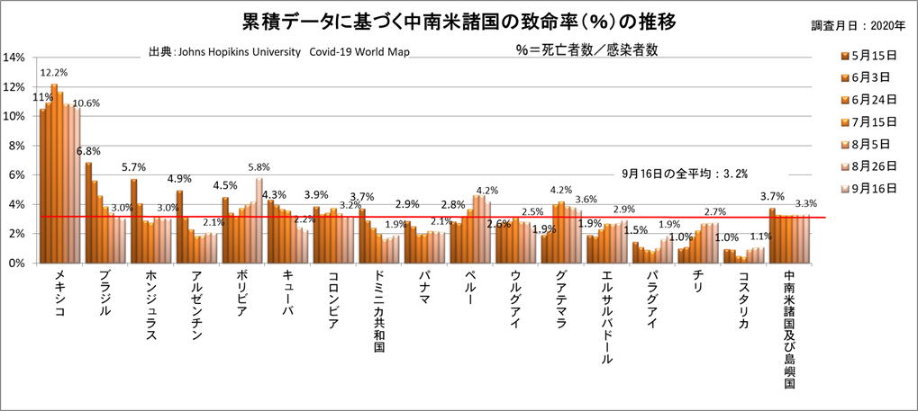 赤線は本調査が対象とする105ヶ国の9月16日時点の平均CFR値である。今回の場合CFR