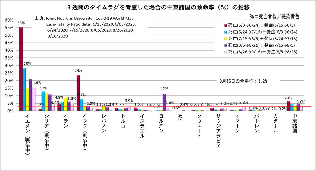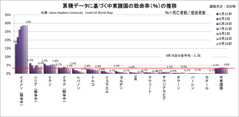 ・中東諸国の平均CFRは5月から9月の4ヶ月の間、3.2%から3.6%へと