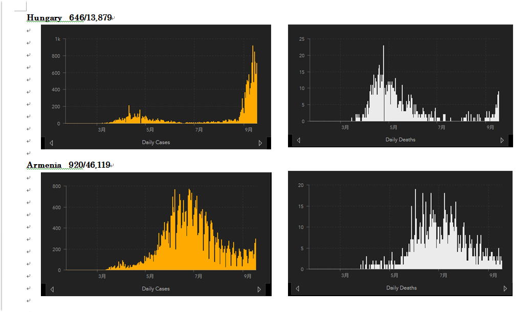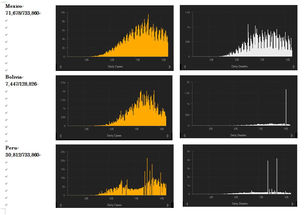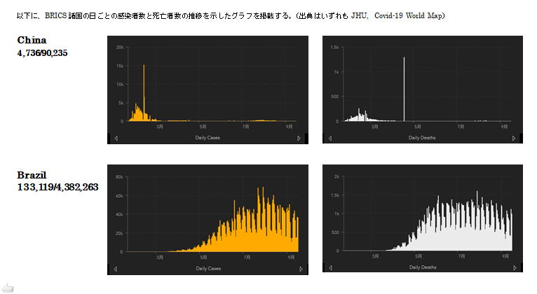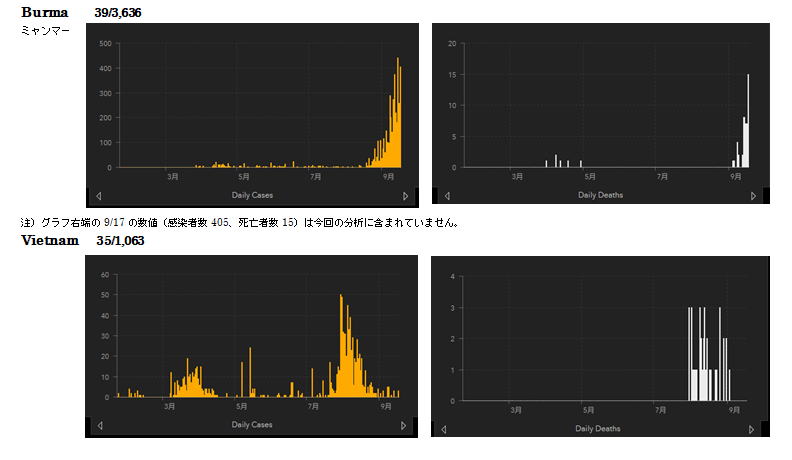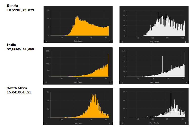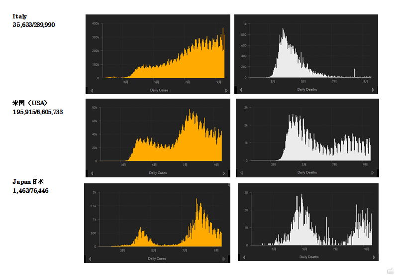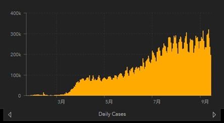 上図より9月16日時点の世界の感染動向を見ると、感染者数、死者数ともに依然として