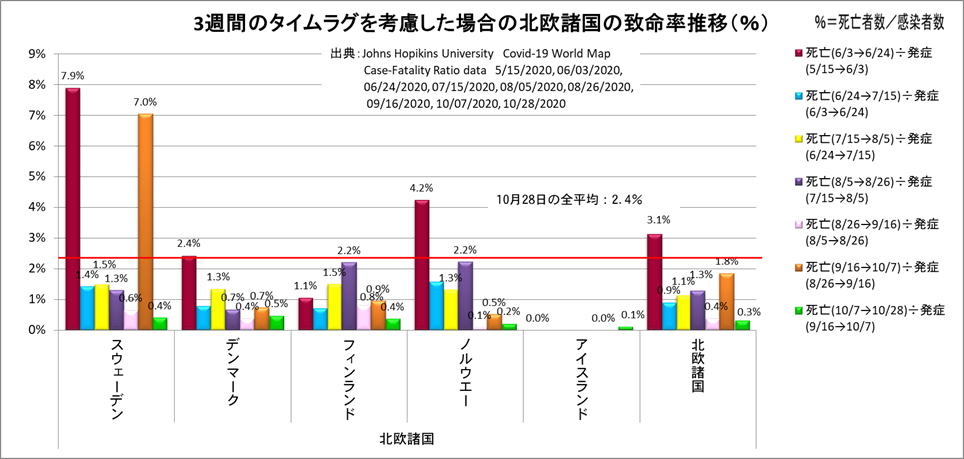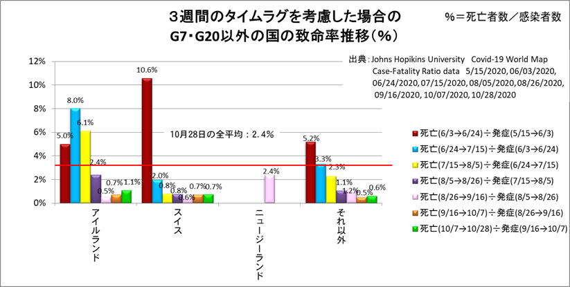 ・タイムラグを考慮した場合、このグループの致命率は5.6%から2.5%へと3.1ポイント低下している。