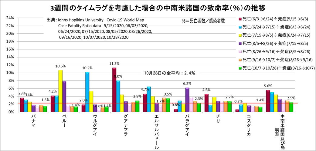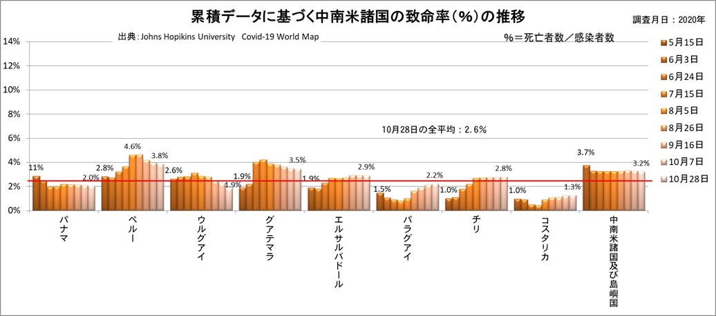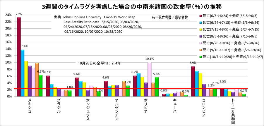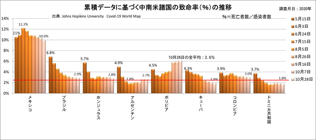・メキシコでは6月の致命率が23%と極めて高かったが、9月上旬に8%まで低下したが、さらに10