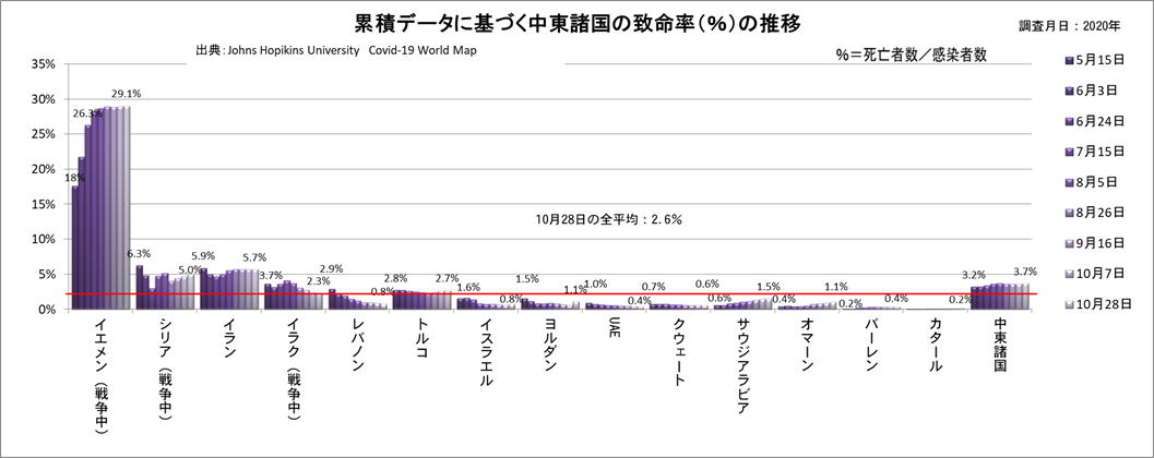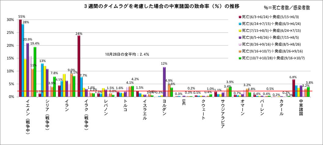 ・中東諸国の平均CFRは5月から10月28日の5ヶ月半の間、3.2%から3.7%へとわずかに上昇