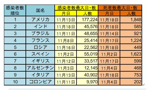 ちなみに、感染者数上位10ヶ国について11月に入ってから11月20日までの新規感染者数