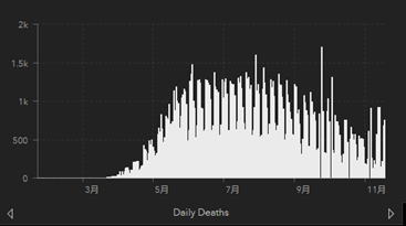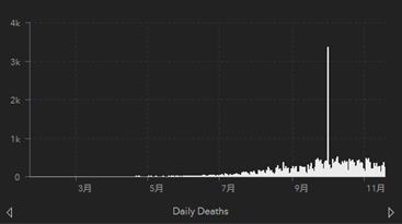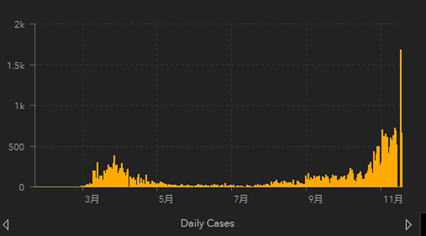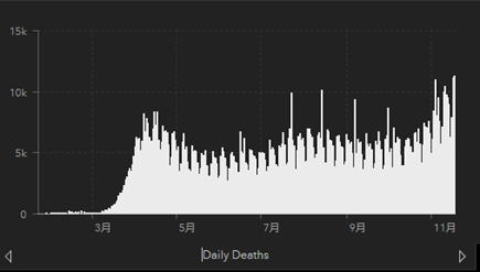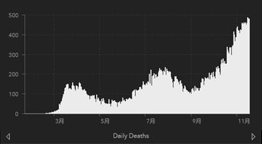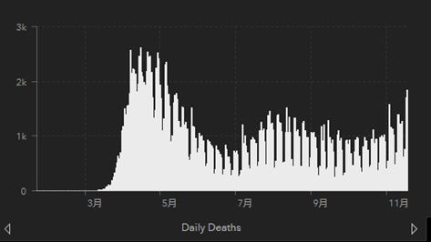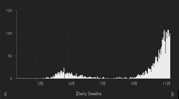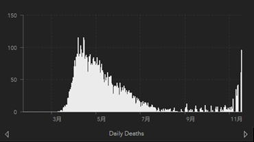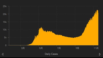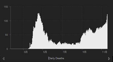 が8,000人/日まで上昇、死亡者数も11月初旬に100人/日に迫っている。11月下旬にはピークを